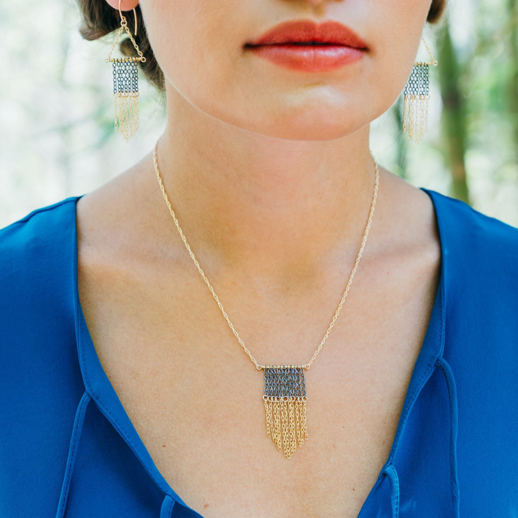 Defined by modern elegance, Kate Winternitz creates delicate, thoughtful jewelry to showcase her love of detail and composition. The Liz Necklace features a cascading silhouette of mixed metal chains that create a beautiful contrast. Made from 14kt gold fill and oxidized sterling silver, the pendant portion measures 1.33" long and 0.75" wide. The chain can be worn between 16-18". Handmade in US.