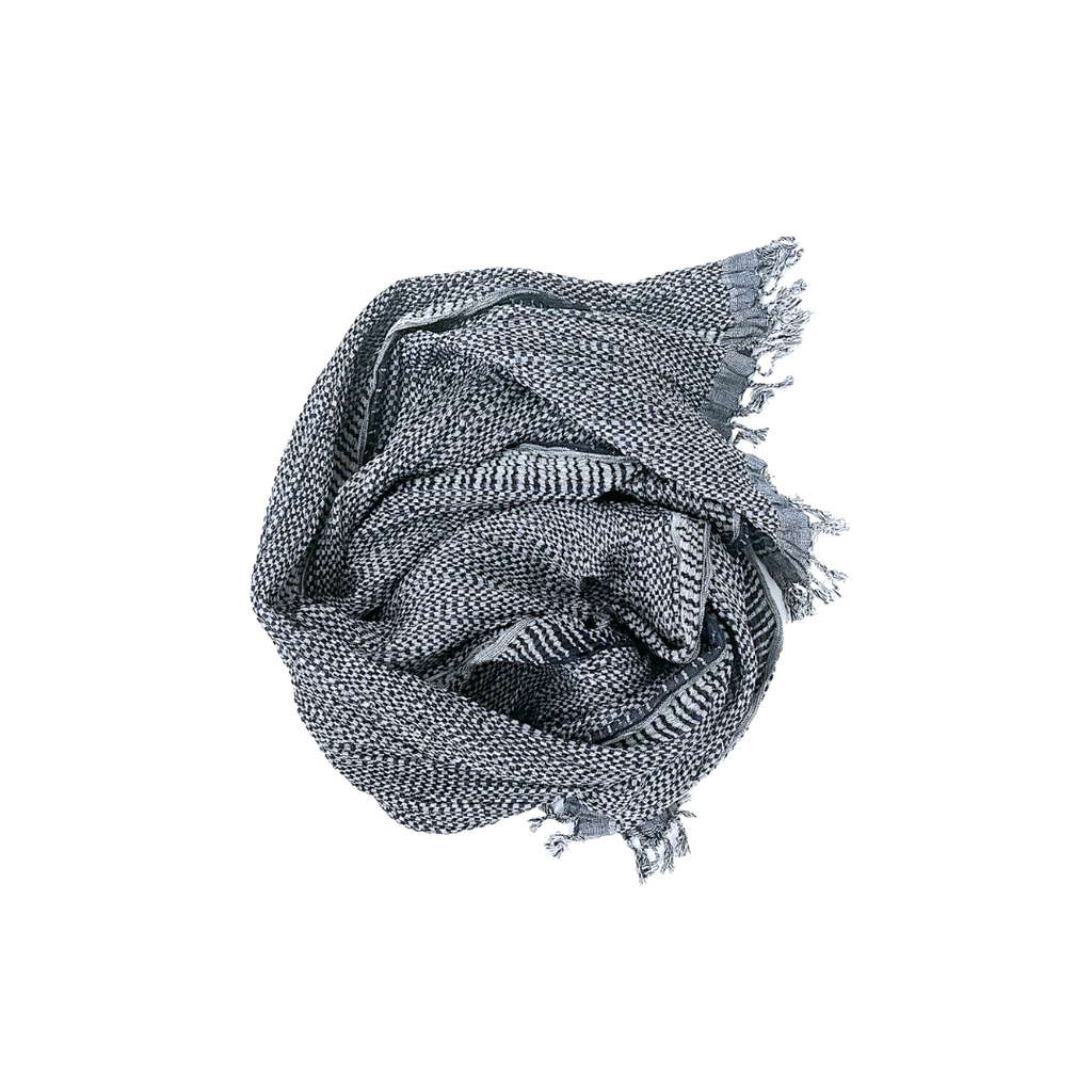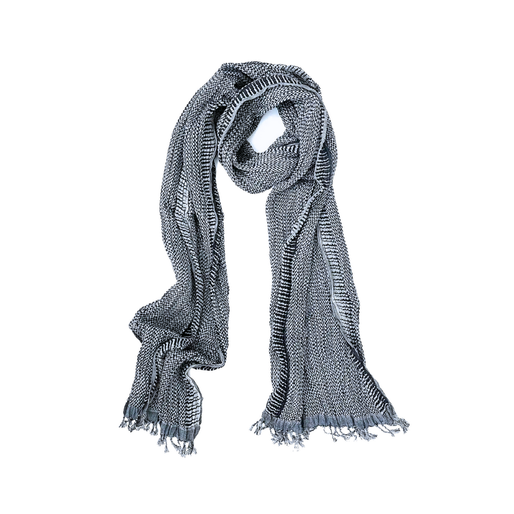 Combining traditional techniques with a contemporary design, this handwoven crinkled silk scarf in shades of dark navy and grey by Marigold Row is the perfect accessory year around for everyday wear. Measures 24"x 72". Hand wash cold separate or dry clean. Handmade in India.
