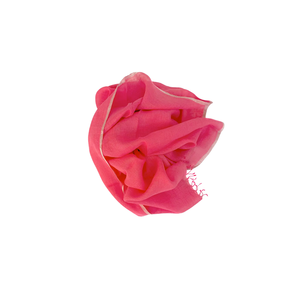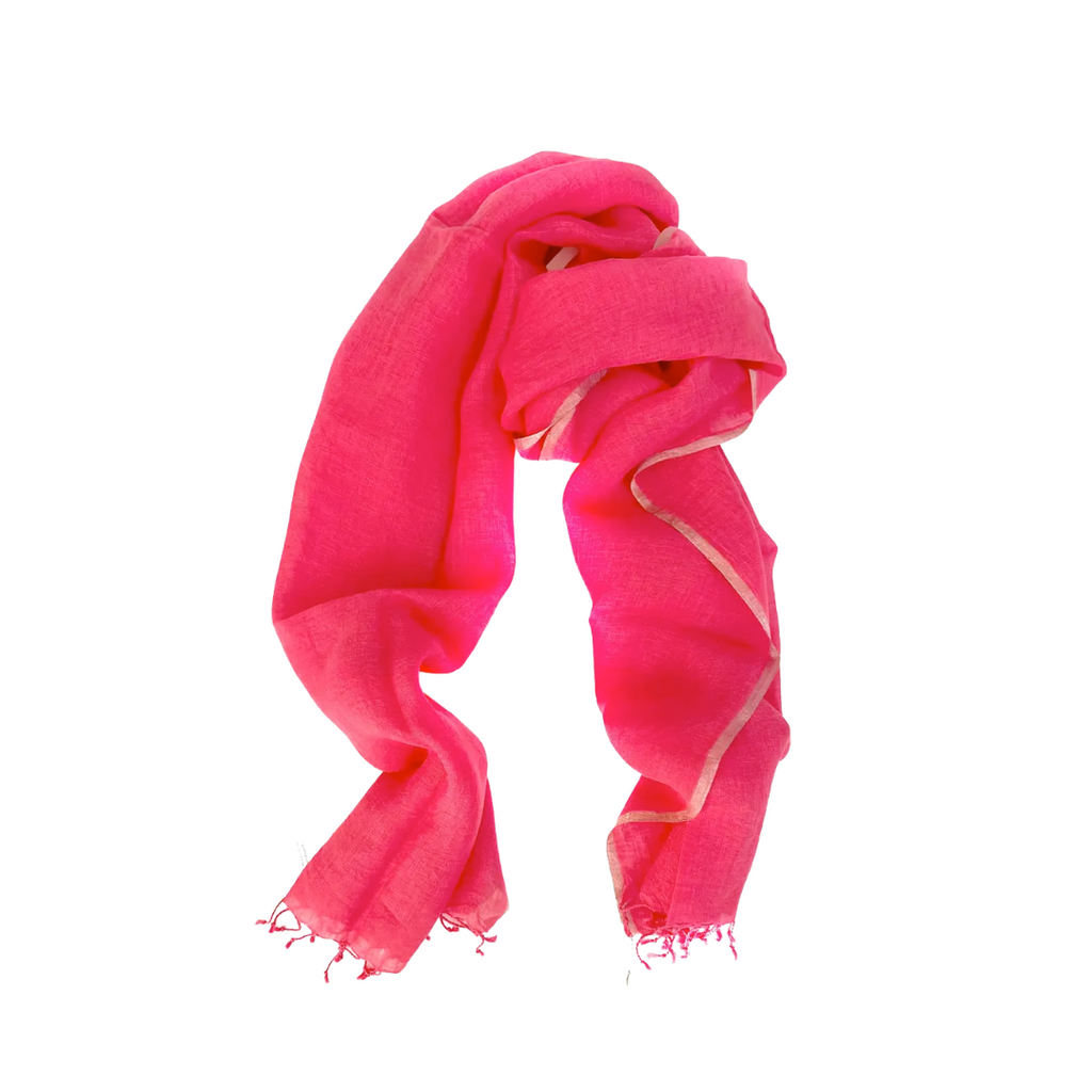 This beautiful hand woven linen scarf by Marigold Row is the perfect accessory for spring and summer. The fuchsia scarf has silver selvedges and measures 22"x 80". Handwash cold separate. Handmade in India.
