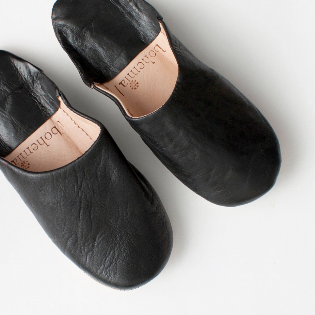 These Bohemia Design slippers are made by a team of highly skilled craftsmen in a family run workshop in Marrakech using traditional techniques. Made of black dyed leather and size men's medium (men's US 10-11). Handmade from the finest quality hides, the leather is cured using organic processes, which may leave a residual scent that will fade once they have had a chance to air out. The leathers are dyed and dried in the sun before being stitched. Minor flaws and imperfections are characteristic of natural materials and traditional methods. CARE: These leather soled slippers are designed for indoor use on smooth, dry surfaces and are not suitable for outdoor or poolside wear. We recommend cleaning your babouche with a dry or slightly damp cloth keeping use of water to an absolute minimum.