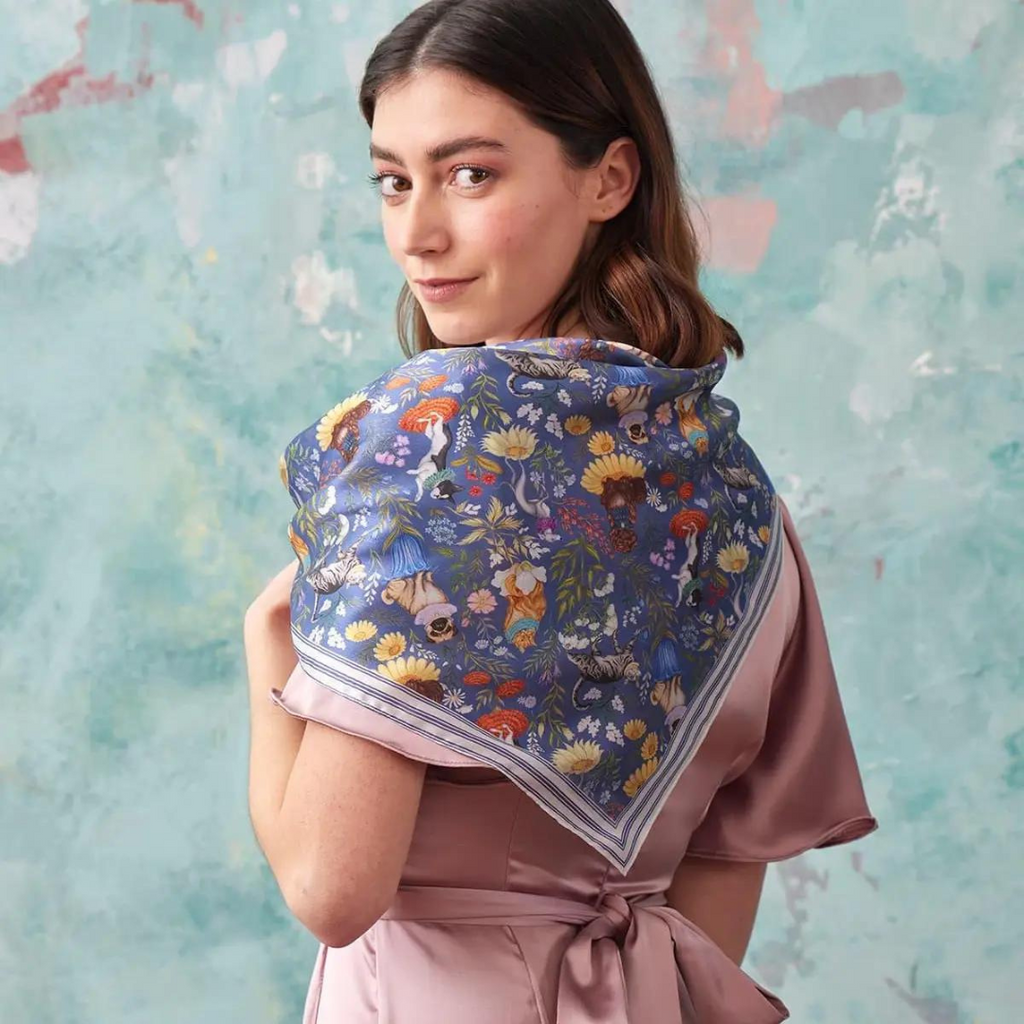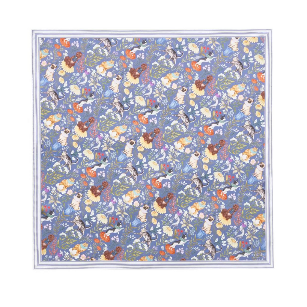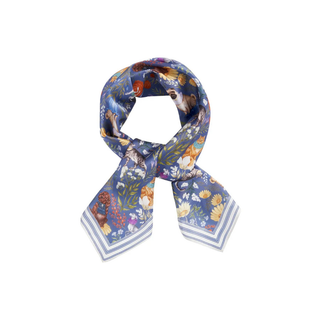 Welcome to the charming world of Fable England! British designer Catherine Rowe has teamed up with Fable to create her whimsical print called Pet Portraits. This ultra soft blue colored square scarf is decorated with Catherine's enchanting portraits featuring a variety of furry friends, including giner & tabby cats, pugs, whippets, and doodle dogs! Wear it as a scarf or tie it around a bag handle. Measures 27.5" x 27.5". Made with 100% recycled polyester. Limited Edition. Handwash only.