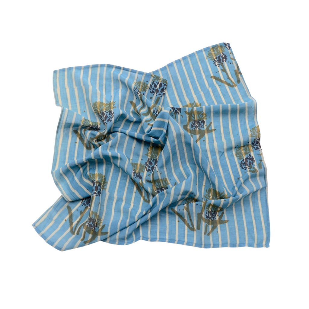 A fun mix of floral and stripes, this sea foam and ivory bandana by Ichcha is dyed naturally and hand block printed using carved wooden blocks. Made of 25% silk and 75% cotton, the Romagna bandana is soft to the touch and great for everyday wear and on special occasions! Wear as a neckerchief, head band, or a hair tie. Measures approximately 22" square. Sizes may vary slightly and there will be some color variance due to the handmade nature of the piece.