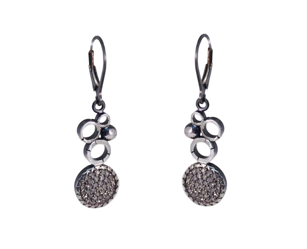 Delicate, geometric, and with just the right amount of sparkle, let jewelry by 314Studio become your go to piece with any outfit. Adorned with pave champagne diamonds, these oxidized silver drop earrings measure 0.38 inches wide by 1.5 inches from the top of the ear wire to the bottom of the earring. Handcrafted in US