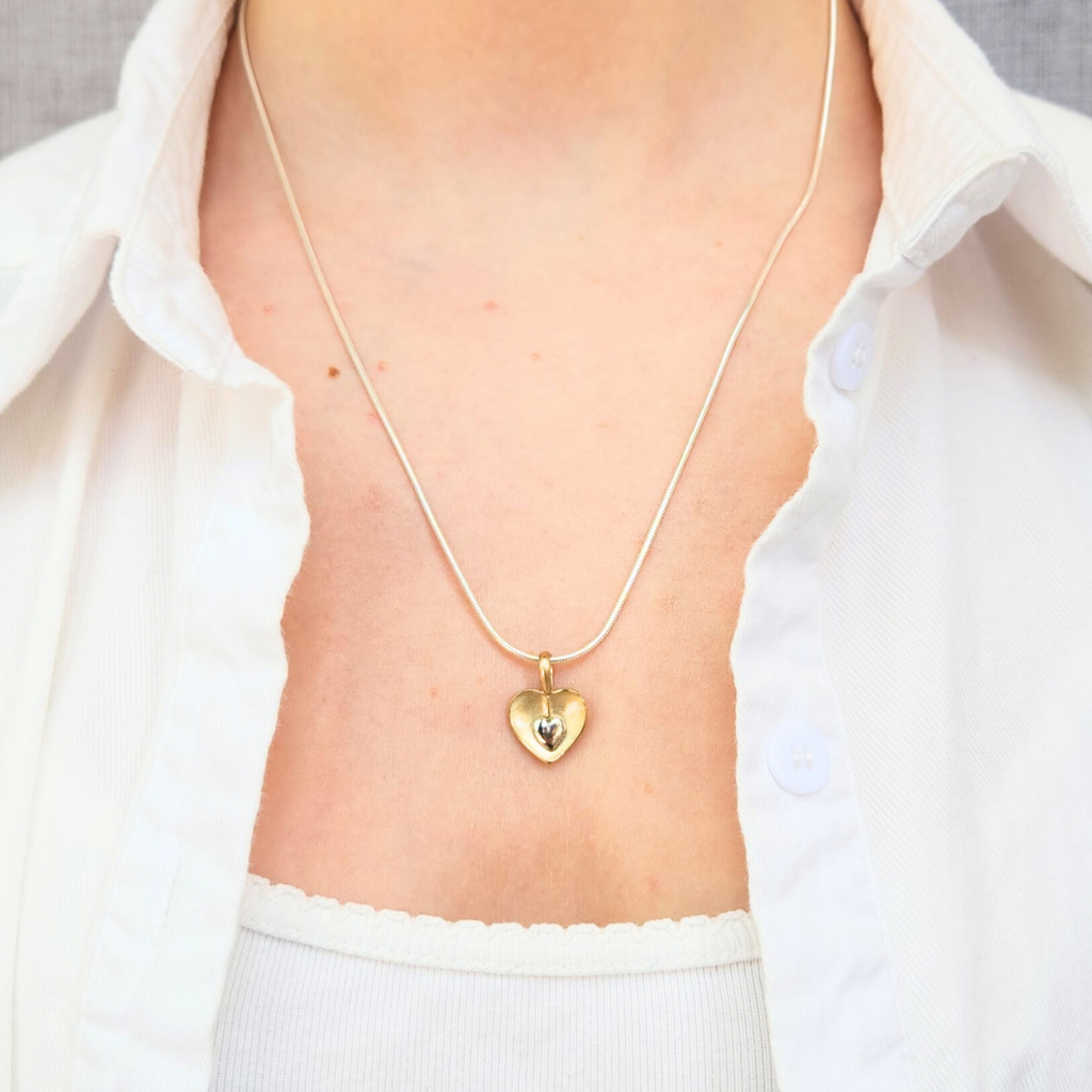 Handmade locally by our wonderful custom designer, Tobi Sznajderman! This two tone pendant is made of a soft textured 14k yellow gold heart with a polished 14k white gold puffy heart in the center. The pendant measures 0.75" long including the bail by 0.5" wide. Pendant only, does not come with a chain. Handmade in the US.