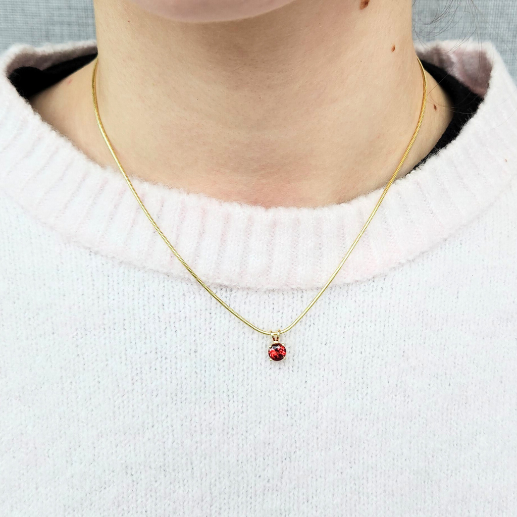 A classic pendant for everyday wear. The pendant features a natural round faceted Mozambique garnet that measures 6mm. The garnet is set in a 14k yellow gold 4-prong mounting with a rabbit ear bail. Pendant only, does not come with a chain.