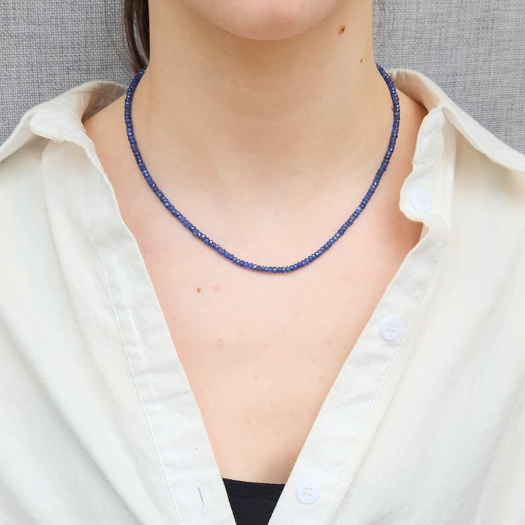 A classic beaded necklace for everyday wear. The blue sapphire beads measure 3.5mm with a 14k yellow gold clasp. The total length measures 16.75".
