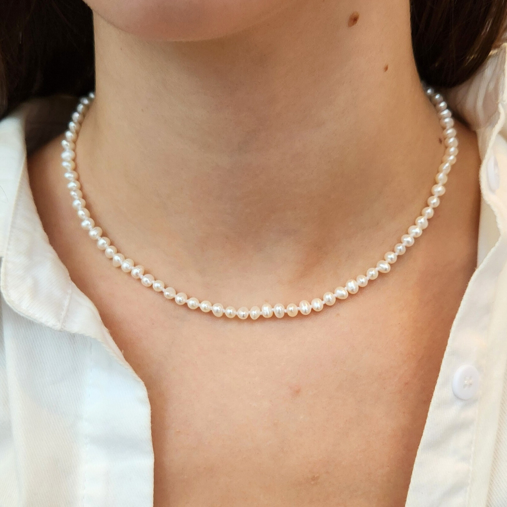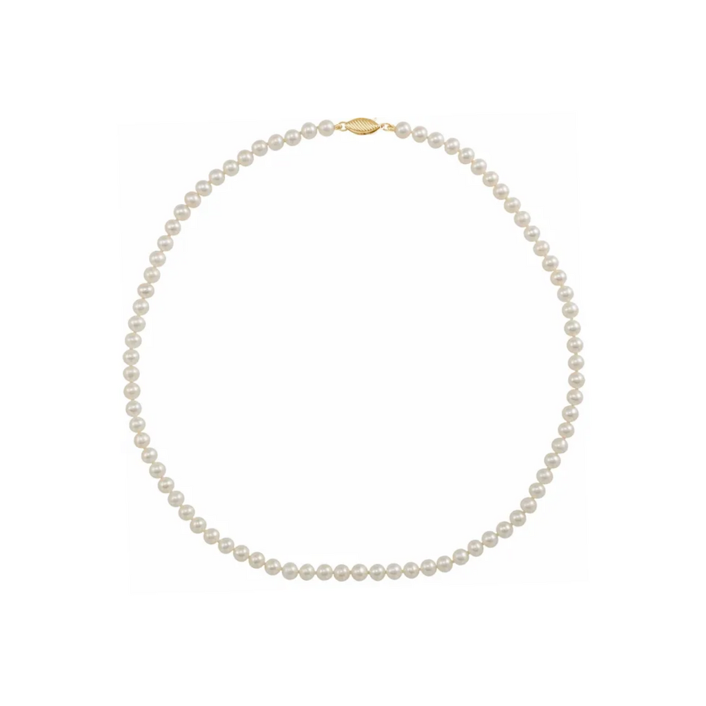 A classic pearl necklace for everyday wear. The cultured white freshwater pearls measure 4.5-5mm and are knotted on white silk with a 14k yellow gold pearl clasp. The total length measures 16".