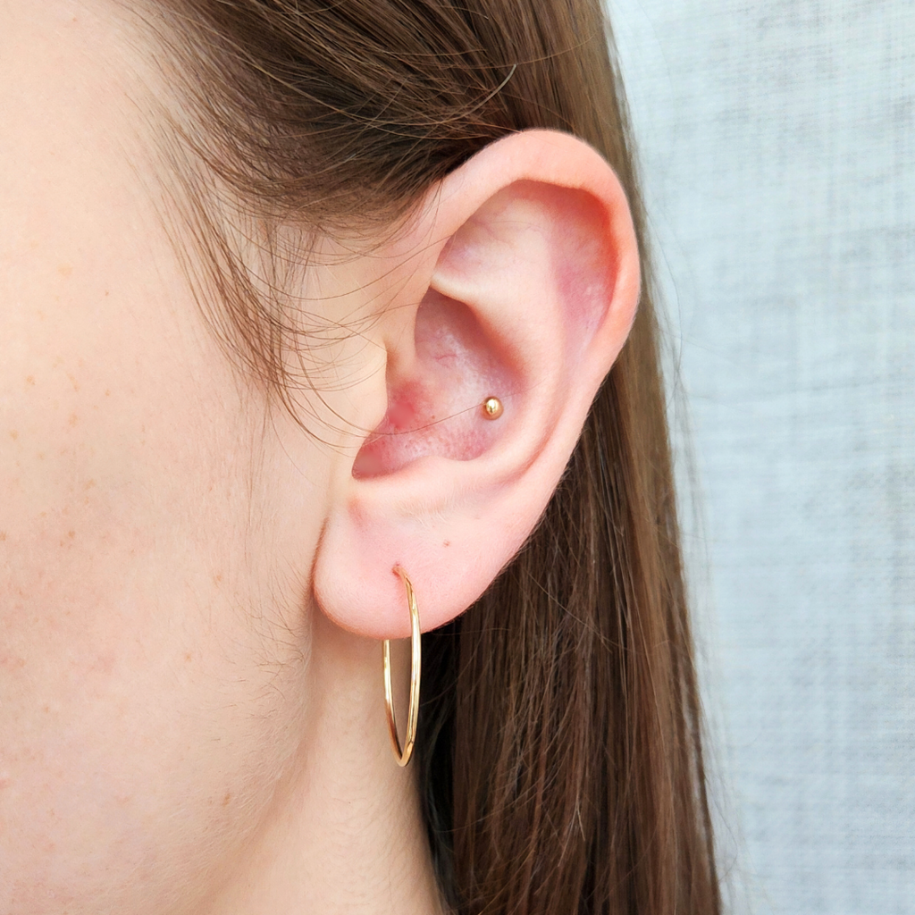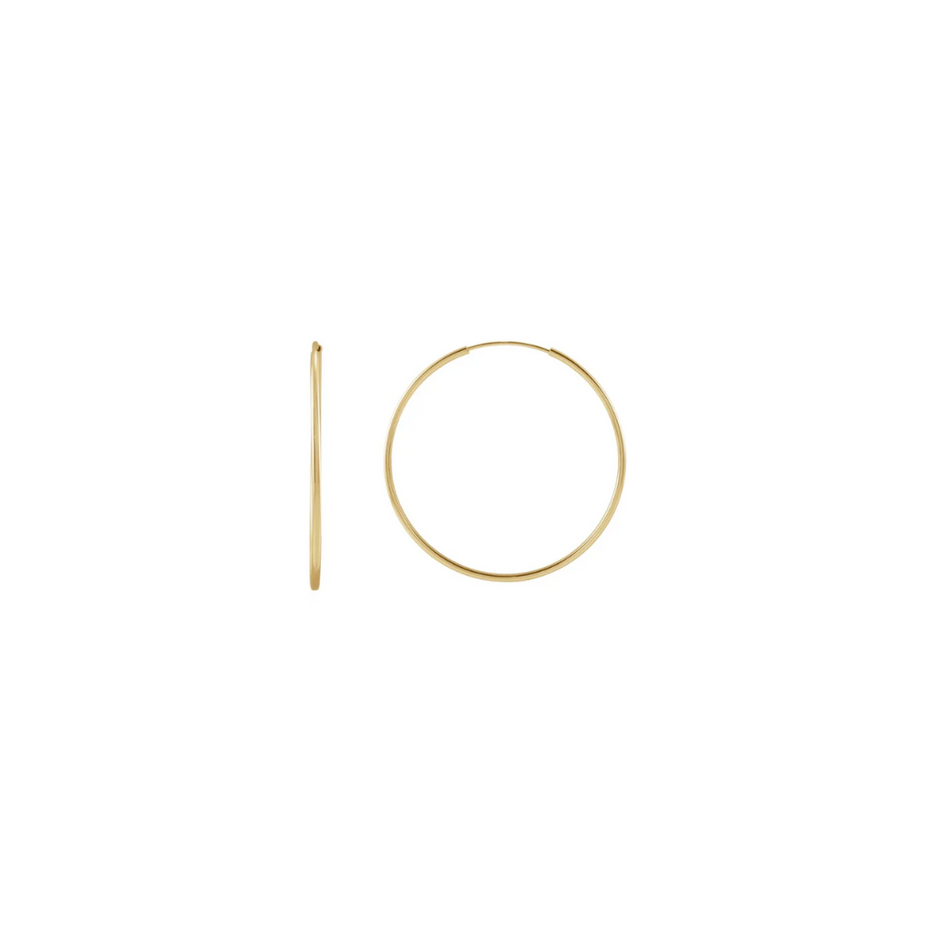 Classic gold hoops for every day wear! These 14k yellow gold endless flexible tube hoops measure approximately 1" in diameter and are 1mm thick.