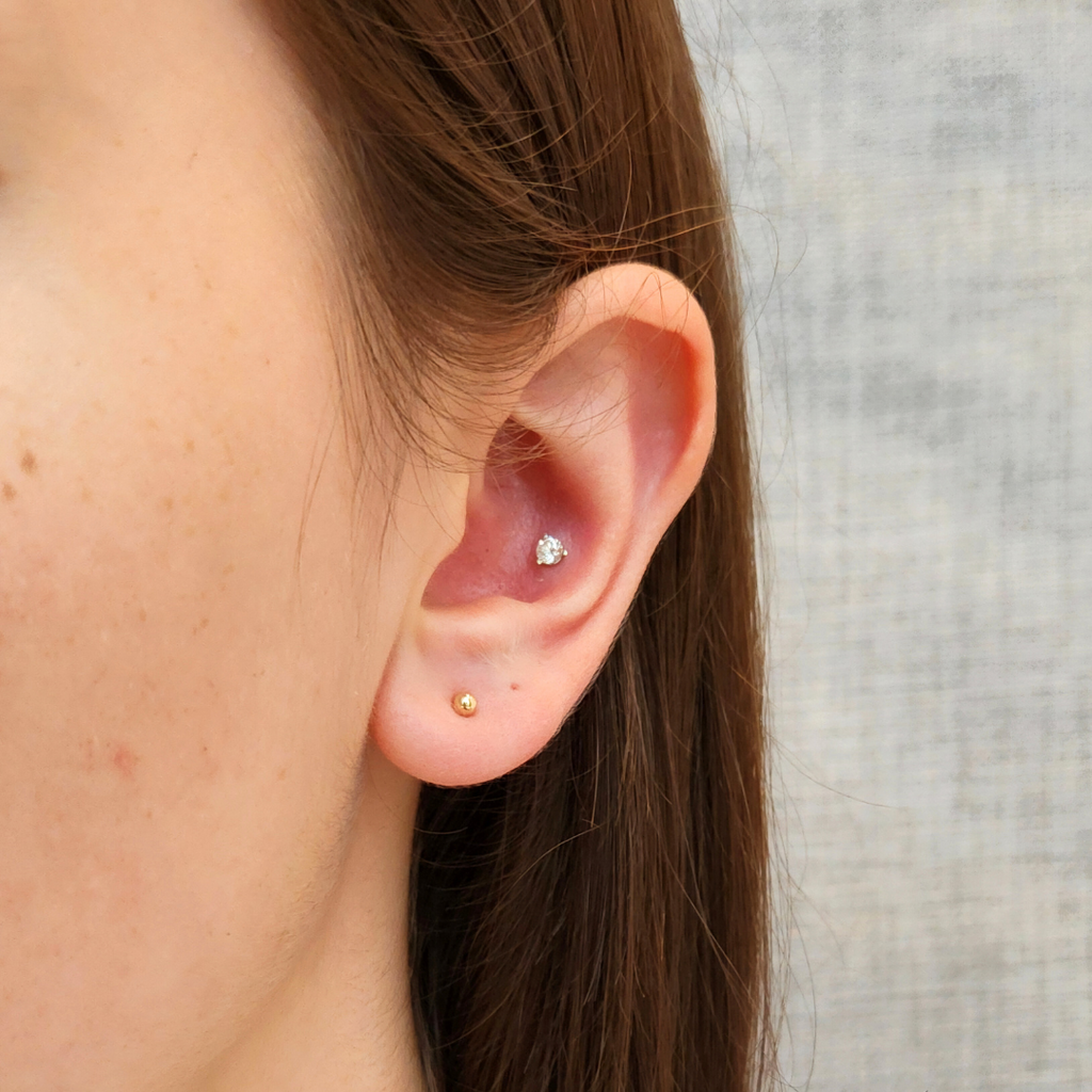 Classic gold ball studs for everyday wear. These 3mm hollow ball studs are made of 14k yellow gold on friction posts with backs.