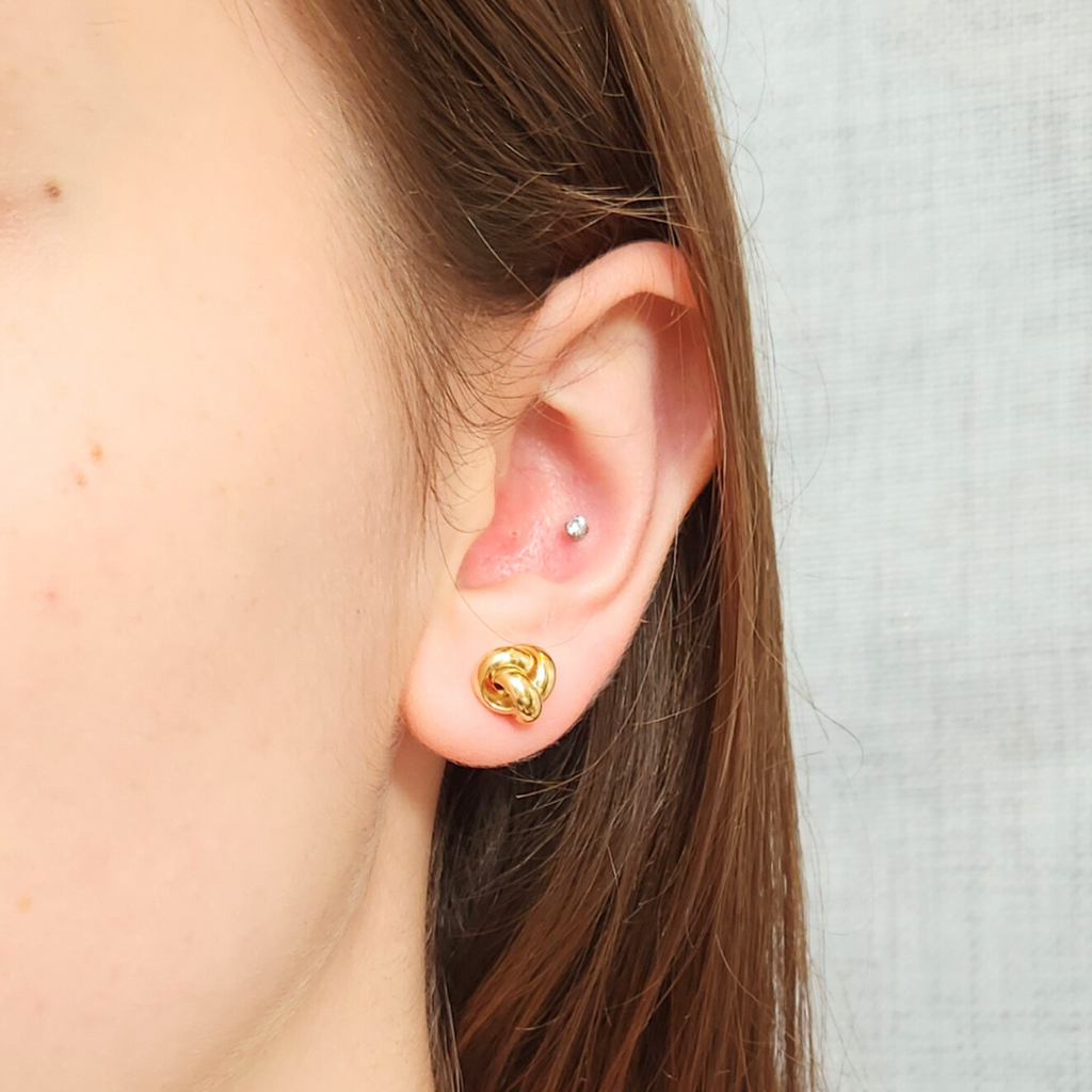 Classic gold knot studs for everyday wear. These 9mm hollow knot studs are made of 14k yellow gold on friction posts with backs.