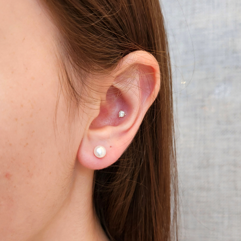Classic pearl studs for everyday wear. These white freshwater cultured pearls are on 14k yellow gold friction posts with backs. The pearls measure 6-7mm.