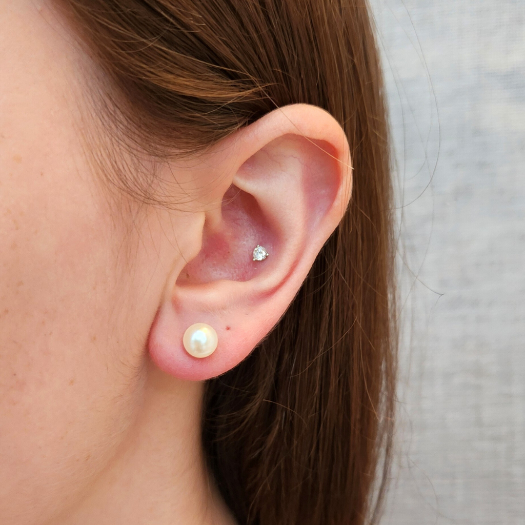 Classic pearl studs for everyday wear. These white freshwater cultured pearls are on 14k yellow gold friction posts with backs. The pearls measure 7-8mm.