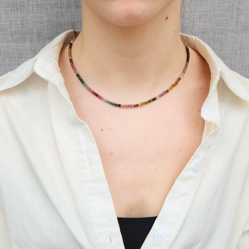 A classic beaded necklace for everyday wear. The watermelon tourmaline beads measure 3mm with a 14k yellow gold clasp. The total length measures 16".