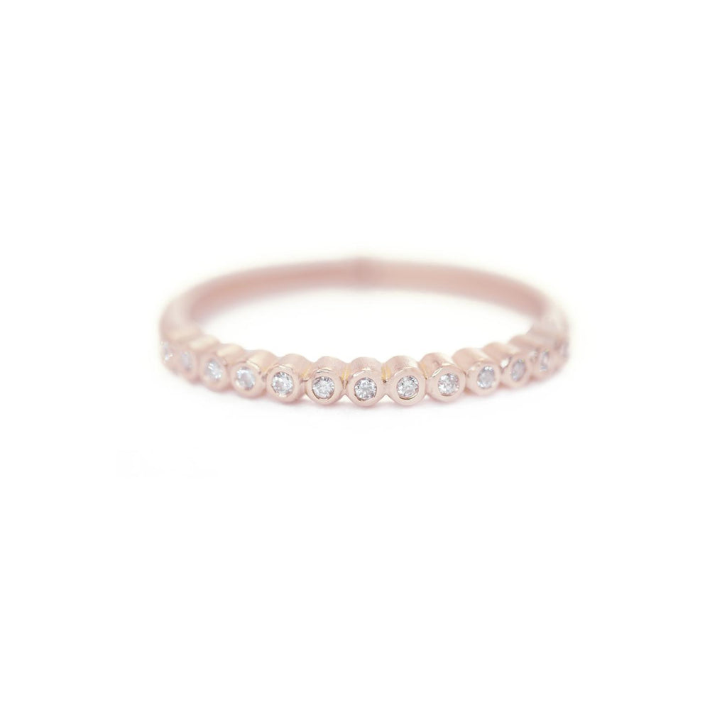 This Megan Thorne band is made of 18k rose gold with a row of bezel set diamonds (0.07ctw), brushed finish band, and a hidden bezel set diamond on the bottom of the band. Measures approx. 1.75mm wide and is a size 6.5. Available for order in other metals and sizes. Please call us at 413-586-1119 for more information.