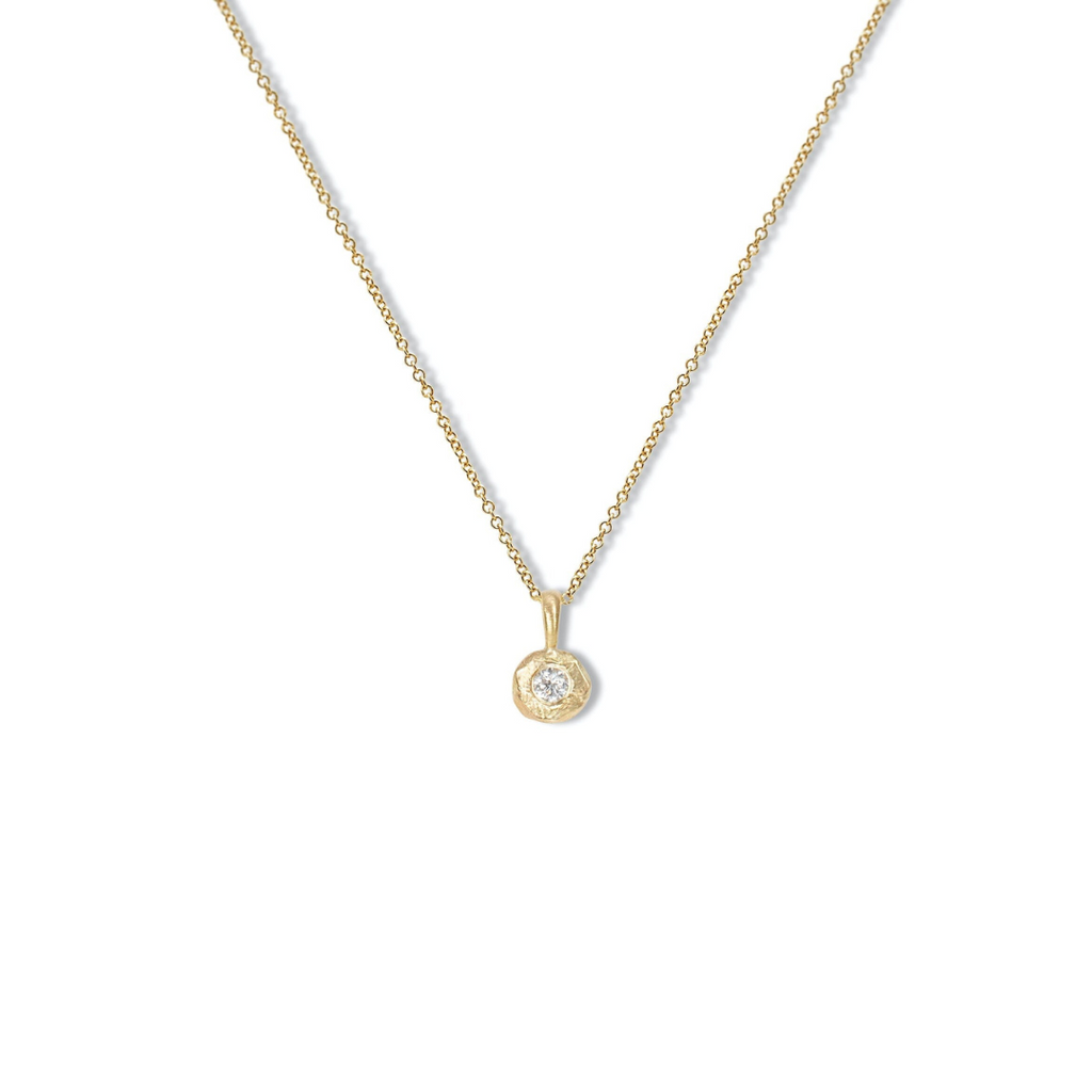 Add sparkle to your jewelry collection with this diamond necklace by Page Sargisson! The necklace features a 2.5mm round brilliant cut diamond set in Page's signature brush stroke textured bezel. The diamond has a weight of 0.06ct and is G/H color and SI clarity. Made of 18k yellow gold, the pendant measures 0.2" wide and 0.37" tall. The chain is 18" in length. Each piece is handmade, so the shape, texture, and color may vary from the photo. Handcrafted in US.