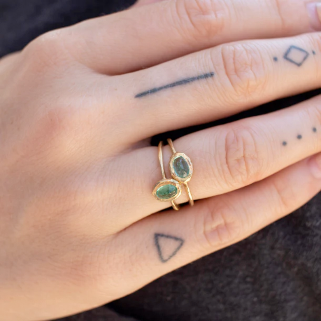 Add a sweet pop of color to your jewelry collection with this oval sapphire ring by Page Sargisson! The ring features a 0.65ct rose-cut oval emerald set vertically in Page's signature brush stroke textured bezel with a textured shank. Made of 18k yellow gold, the stone and bezel together measure 0.25" wide and 0.31" tall. The ring size is a 5.5. Each ring is handmade, so the shape, texture, and color may vary from the photo. Handcrafted in US.