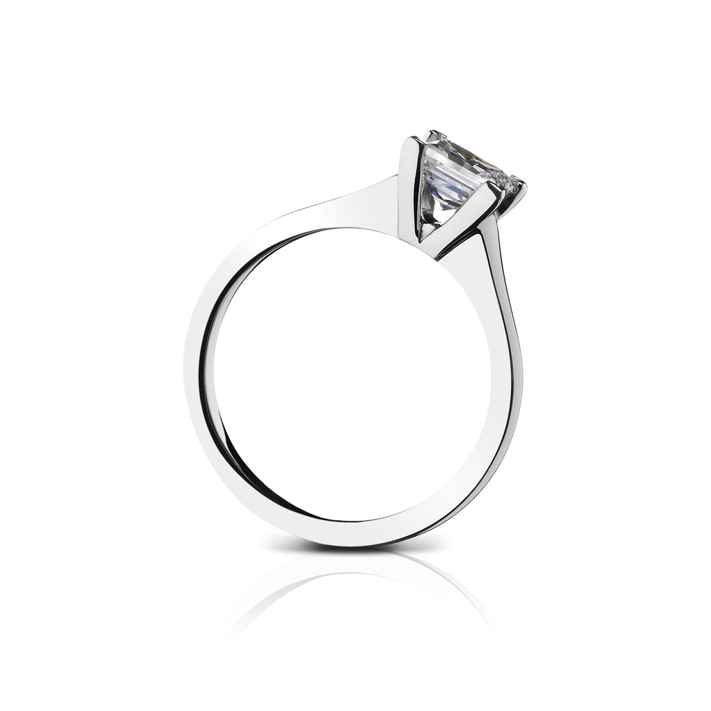 This Sholdt Design engagement ring is made of 18K white gold with a four prong set 1ct cubic zirconia square center, with a simple tapered band. Measures approx. 2.7mm wide and is a size 6.5. Available for order in other metals, sizes, and center stones. Please contact us at 413-586-1119 for more information.