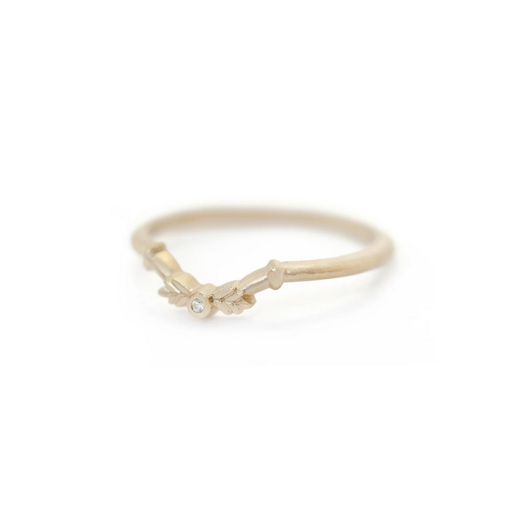 This Megan Thorne band is made of 18k yellow gold with a single, tiny bezel set diamond, flanked by leaf details in a curved band. Measures approx. 1.5mm wide and is a size 6.5. Available for order in other metals and sizes. Please call us at 413-586-1119 for more information.