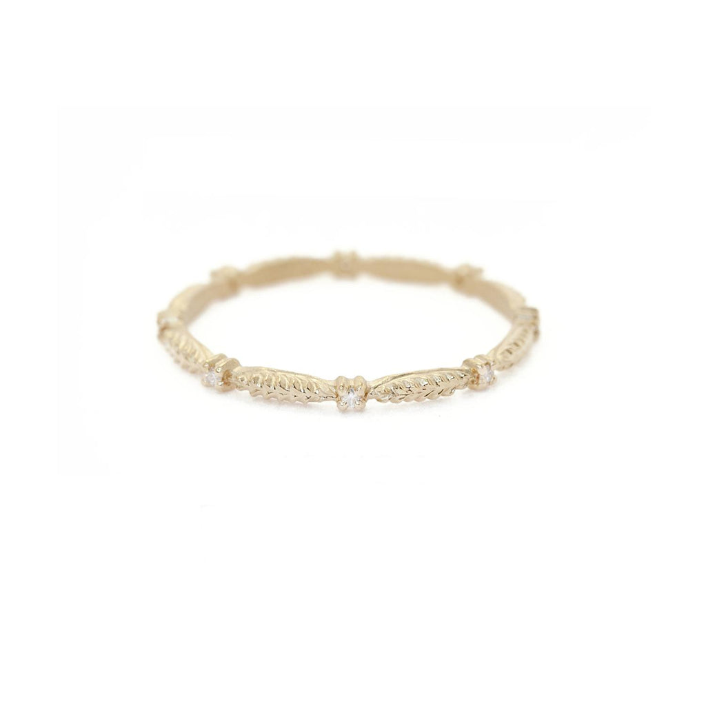 This Megan Thorne band is made of 18k yellow gold with prong set diamonds (0.4ctw) and a brushed finish Evergreen leaf detail band. Measures approx. 1.5mm wide and is a size 6.5. Available for order in other metals and sizes. Please call us at 413-586-1119 for more information.