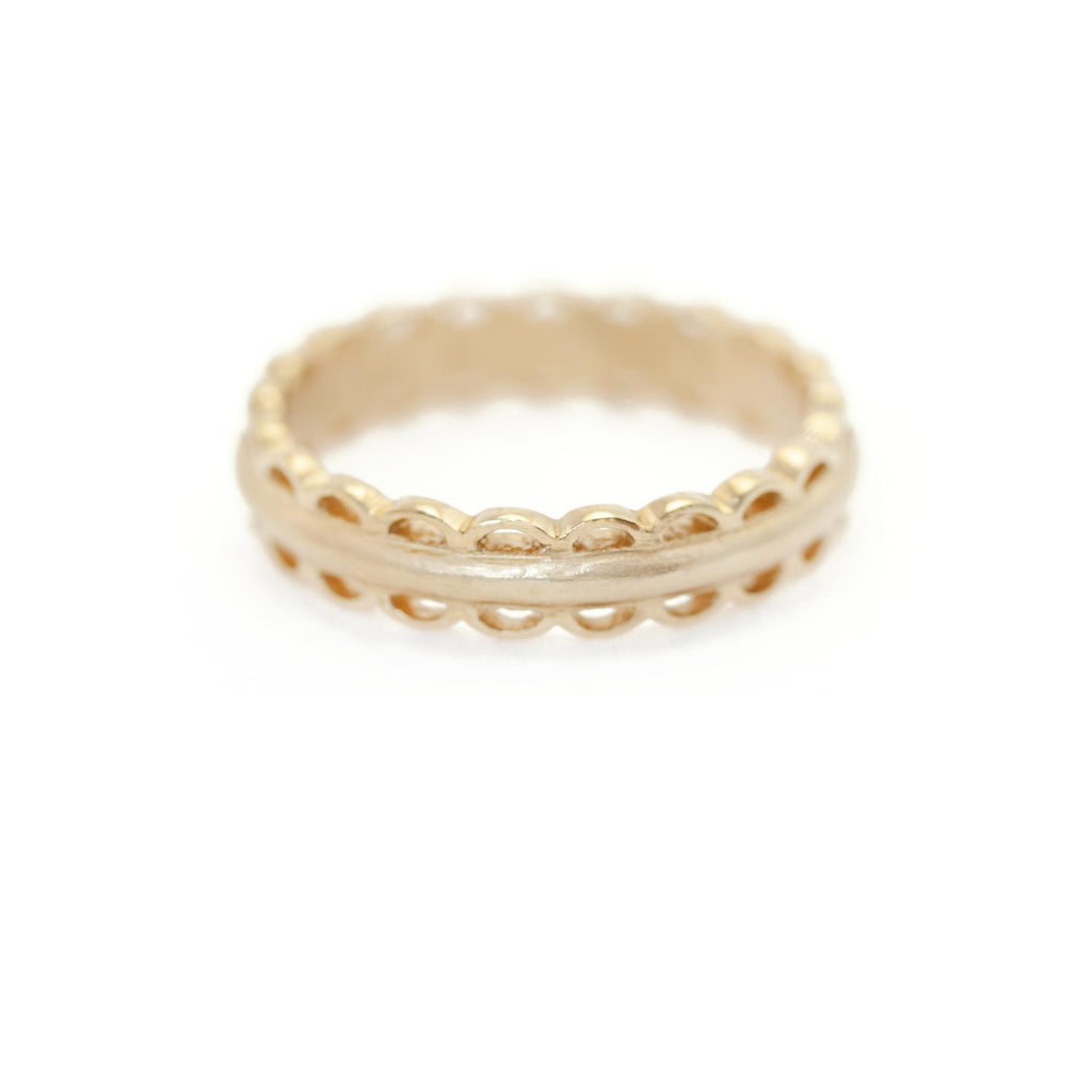 This Megan Thorne band is made of 18k yellow gold with a cut out, scalloped edge. Measures approx. 4mm wide and is a size 6.5. Available for order in other metals and sizes. Please call us at 413-586-1119 for more information.
