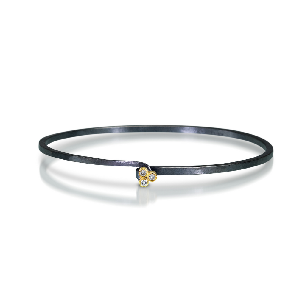 Understated, yet eye catching, this hook bracelet by Karin Jacobson is made of oxidized sterling silver with a cluster of 3 round brililant cut diamonds (0.075ct total) that are bezel set in 18k yellow gold. Bracelet is a size medium and fits a 7" wrist. Handcrafted in US.