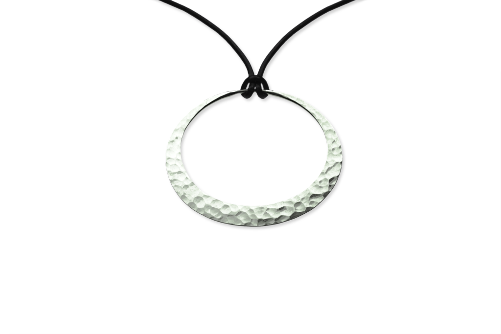 It's a classic! Elegant, simple and lightweight, the Eclipse Pendant by Toby Pomeroy will be your go­to necklace. This hand forged, textured pendant is effortless and perfect for all occasions. The pendant (38mm) is made of recycled silver and has an adjustable black silk cord lanyard with silver finials. Handcrafted in US.