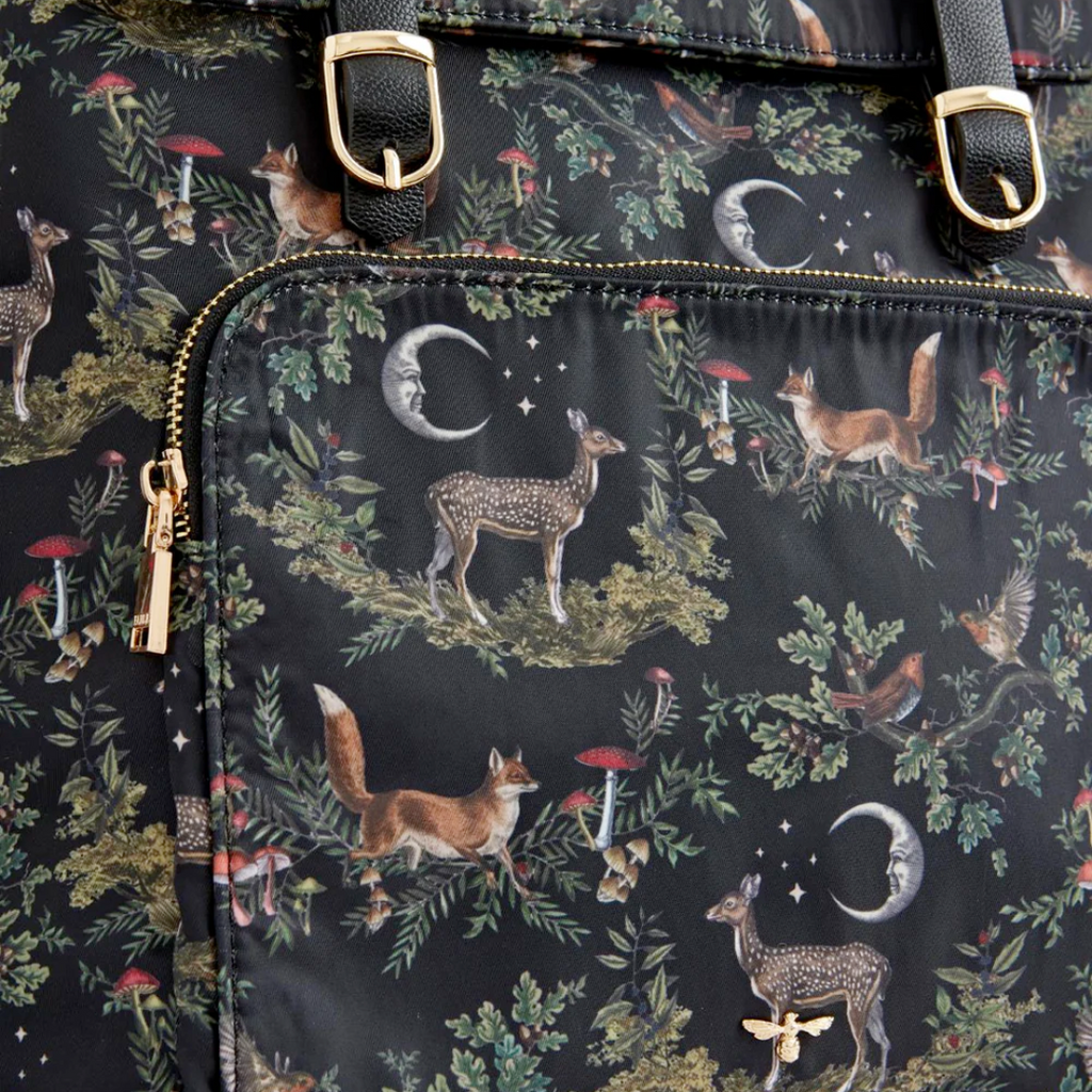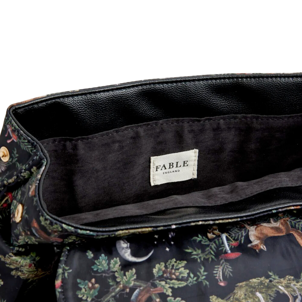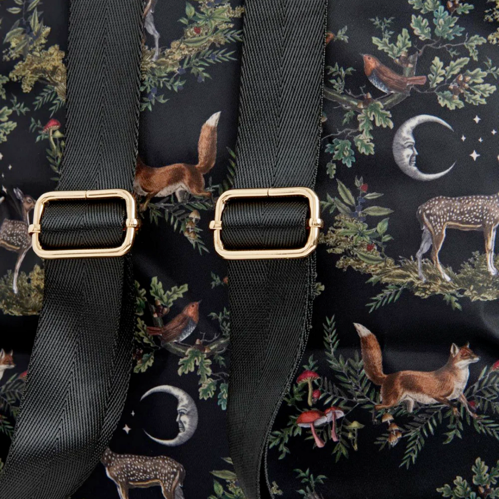 Welcome to the charming world of Fable England! Featuring Fable's Night's Tale print, this backpack tells a tale of winter's night in the forest beneath a crescent moon with foxes, birds, and deer. Crafted from durable nylon, this stylish bag is spacious and ready to go on adventures with you! The bag has buckled straps with snap closure and zipped outer pocket, as well as one zipped pocket and two inner open pockets inside. Measures approximately 11.5" across, 15.7" tall, and 5.3" deep. Nylon exterior, polyester interior, and polyester webbing for the adjustable shoulder straps. Gold plated hardware. Wipe clean with a damp cloth. Print layout will vary from photos. Designed in England.