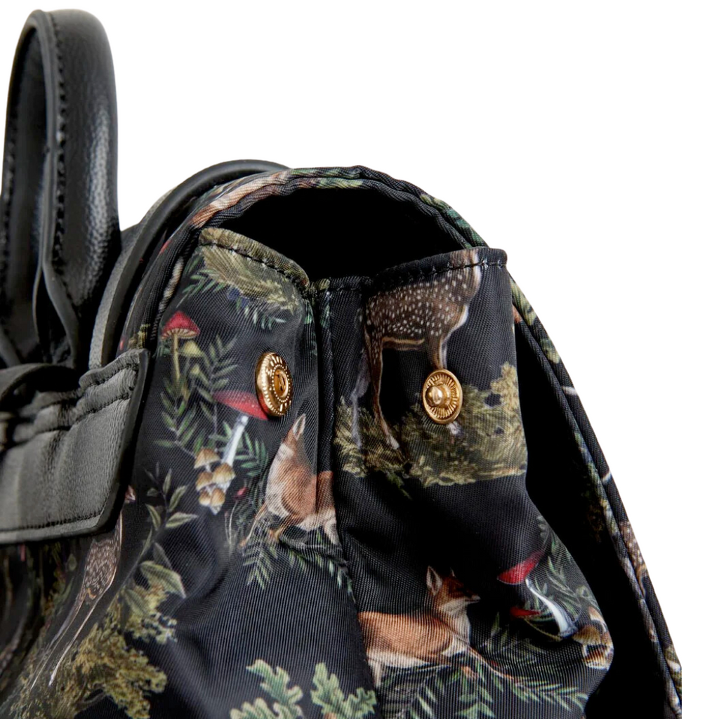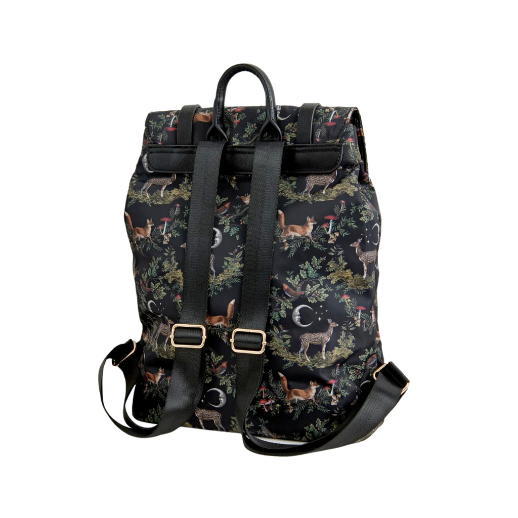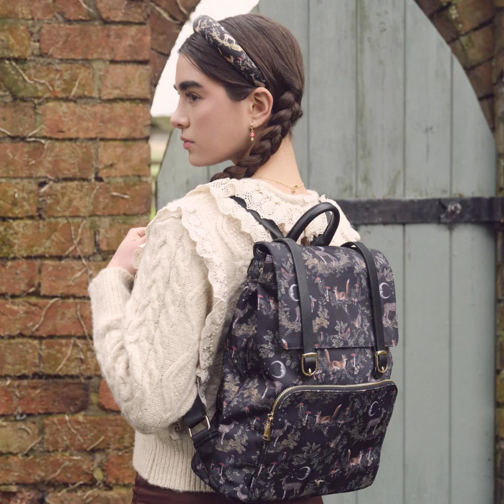 Welcome to the charming world of Fable England! Featuring Fable's Night's Tale print, this backpack tells a tale of winter's night in the forest beneath a crescent moon with foxes, birds, and deer. Crafted from durable nylon, this stylish bag is spacious and ready to go on adventures with you! The bag has buckled straps with snap closure and zipped outer pocket, as well as one zipped pocket and two inner open pockets inside. Measures approximately 11.5" across, 15.7" tall, and 5.3" deep. Nylon exterior, polyester interior, and polyester webbing for the adjustable shoulder straps. Gold plated hardware. Wipe clean with a damp cloth. Print layout will vary from photos. Designed in England.