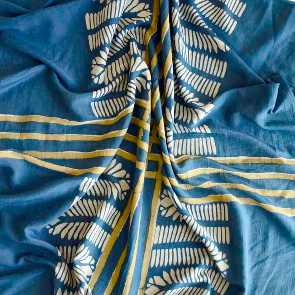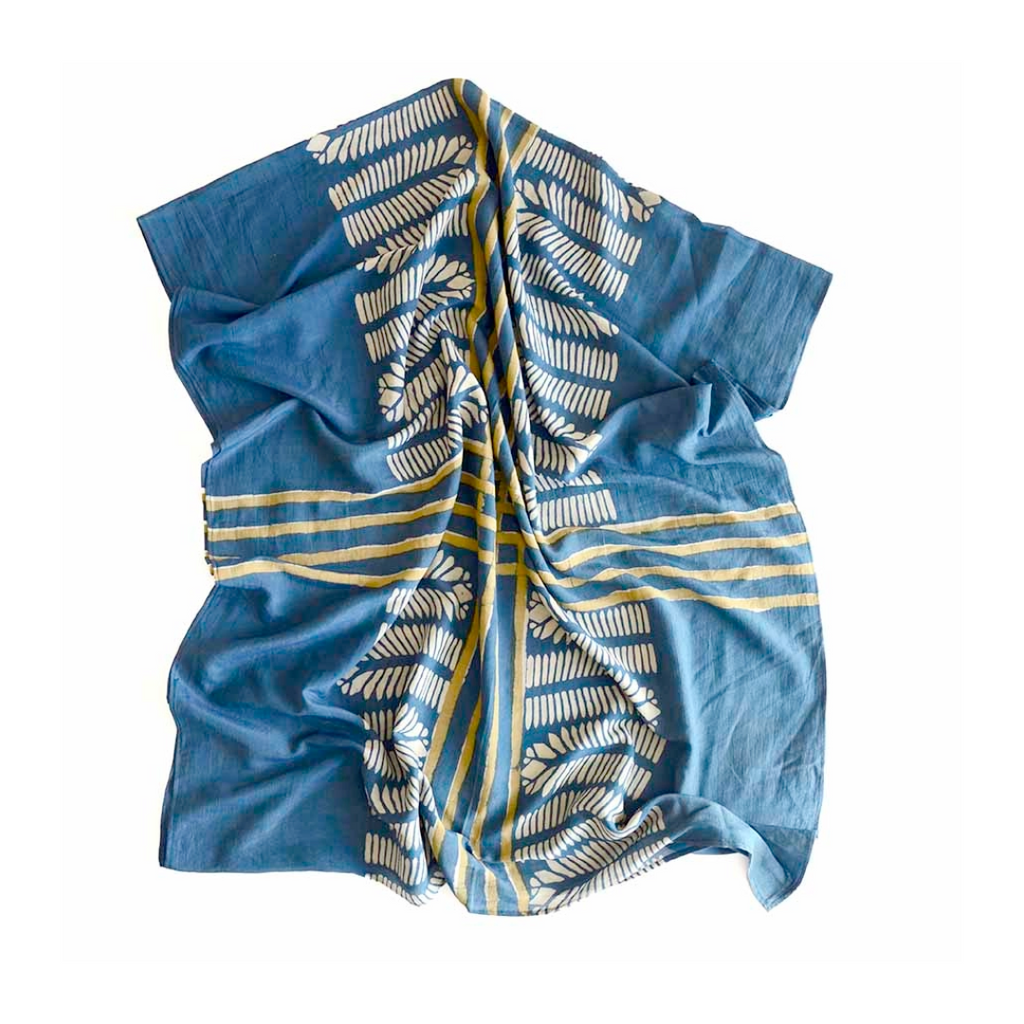Inspired by architectural ceilings of ancient temples in India, this indigo blue, gold, and white scarf by Ichcha is dyed naturally and hand block printed using carved wooden blocks. Made of 25% silk and 75% cotton, the scarf is soft to the touch and great for everyday wear and on special occasions! Measures 34" x 78". Sizes may vary 1-2 inches and there will be some color variance due to the handmade nature of the piece. CARE: hand or machine wash on cold gentle cycle. Lay flat to dry. Iron if necessary.