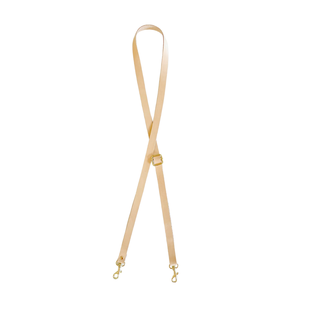 This vegan tan leather adjustable strap works with any of Erin Flett's fun and bold bags with the d-rings such as the satchel and wristlet bags. The strap measures 0.5" wide and can be adjusted from 25"-55.5". The leather will darken and soften over time and includes brass snaps and an adjustable brass slider. Handmade in US.