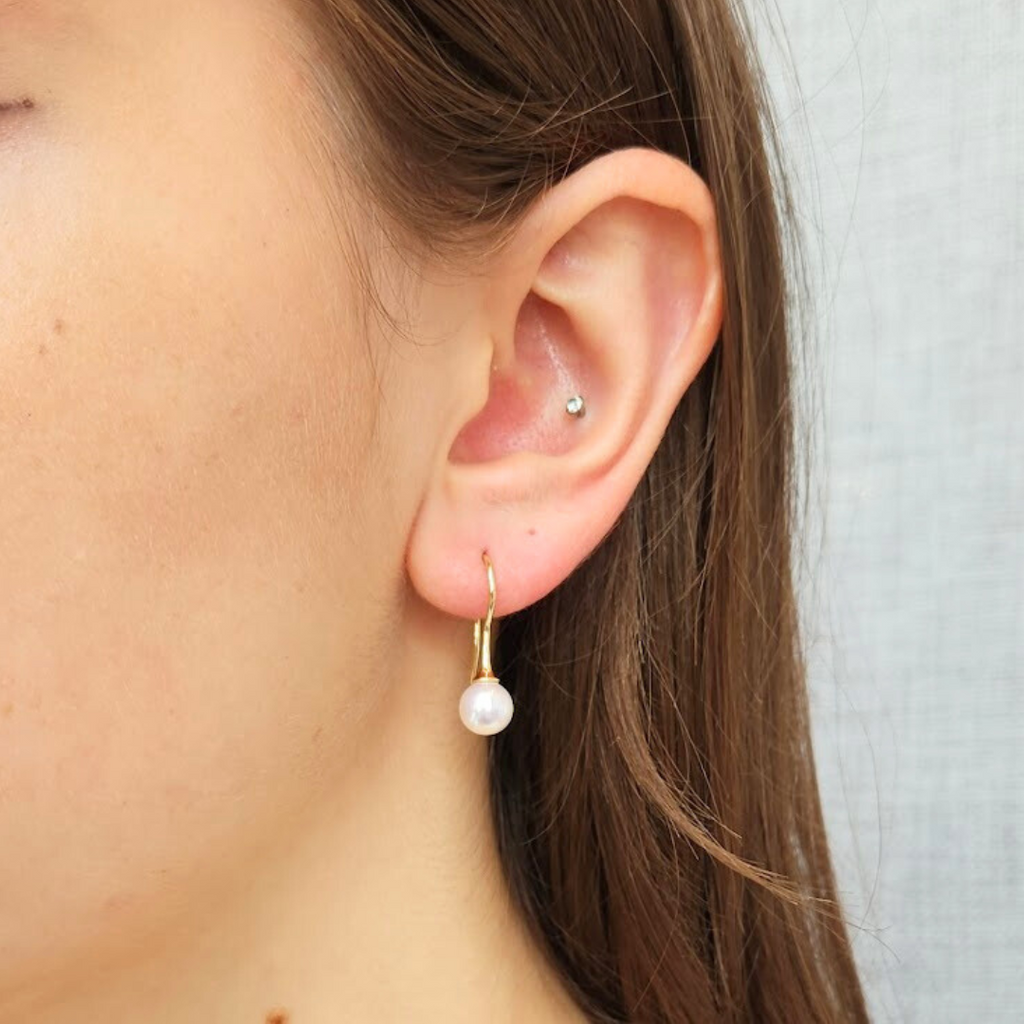 Classic pearl drops with a sleek, modern setting by Breuning. These 7.5mm Akoya cultured pearls are fixed on gold plated sterling silver ear wires that hang 1" long.
