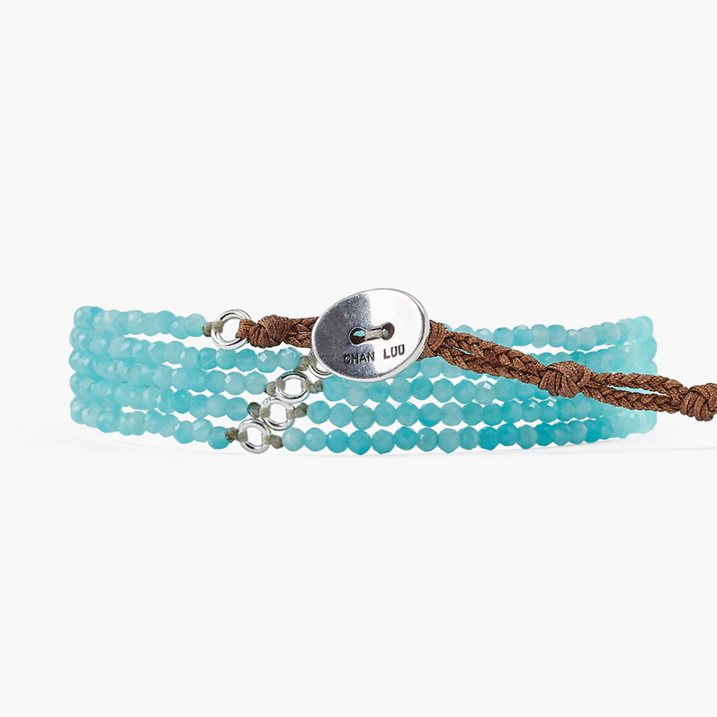 This sweet piece can be worn both as a 5 layer wrap bracelet and a necklace. With round, faceted Amazonite beads, the piece measures 34" (adjustable from 32-34") with a sterling silver signature oval button closure. Handmade in Vietnam.