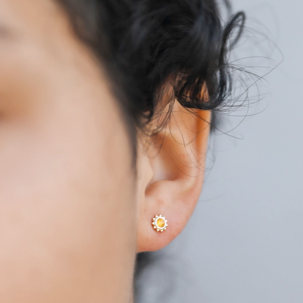 These sun studs by JaxKelly are perfect for everyday wear! The polished amber cabochons are set in a sun-like bezel for a sweet, delicate look. Wear alone or in a stack. Made from 18k yellow gold plate over sterling silver. The earrings measure 0.18" in diameter. Handmade in US.