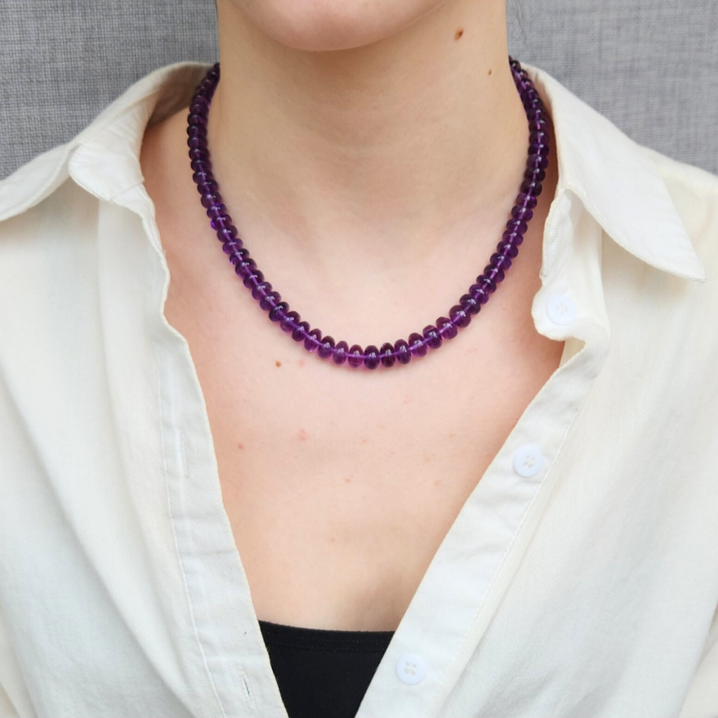 A classic beaded necklace for everyday wear. The purple amethyst beads measure 6.5-9.5mm with a gold filled clasp. The total length measures 16".