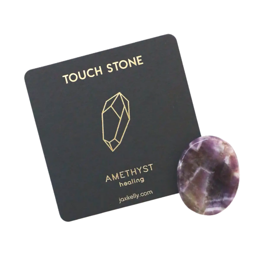 This touch stone by JaxKelly is the perfect tool for centering intentions, focusing energy, relieving stress and more! Made of polished natural Amethyst, this crystal is a beacon of healing. Stone measures approximately 1.5 x 1.25 inches. Each polished natural gemstone will vary in color, tone, and markings.