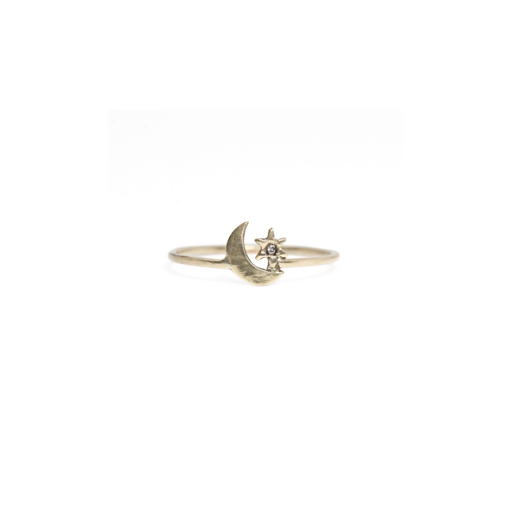 Symbolizing "growth", the crescent star ring by Acanthus is designed to be a daily reminder of what you keep close to your heart. Made of 14k yellow gold, the crescent star features a flush set diamond and sits on a dainty 1mm band. Stack with your existing rings or create a new set with meaning; the Amulet collection is made to mix, match, and layer up. Ring is a size 6.5. Handcrafted in US.