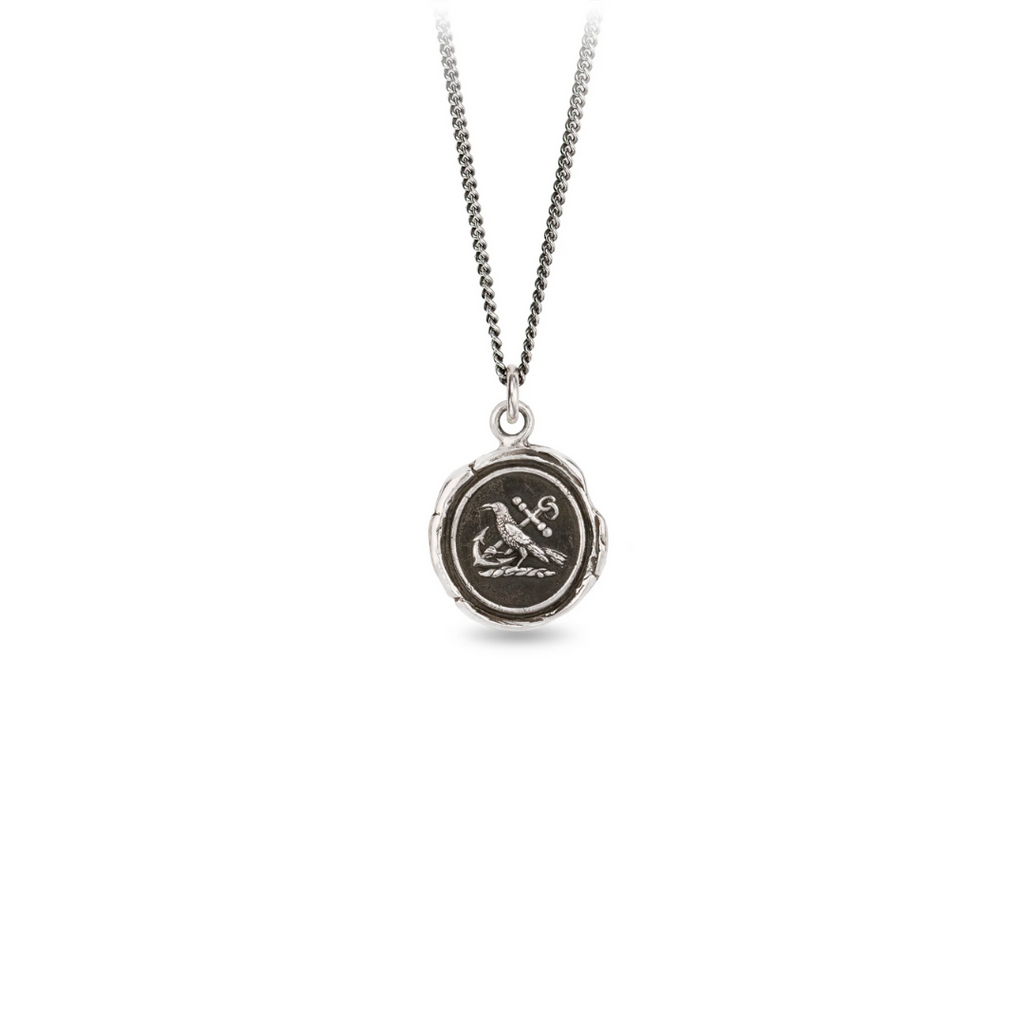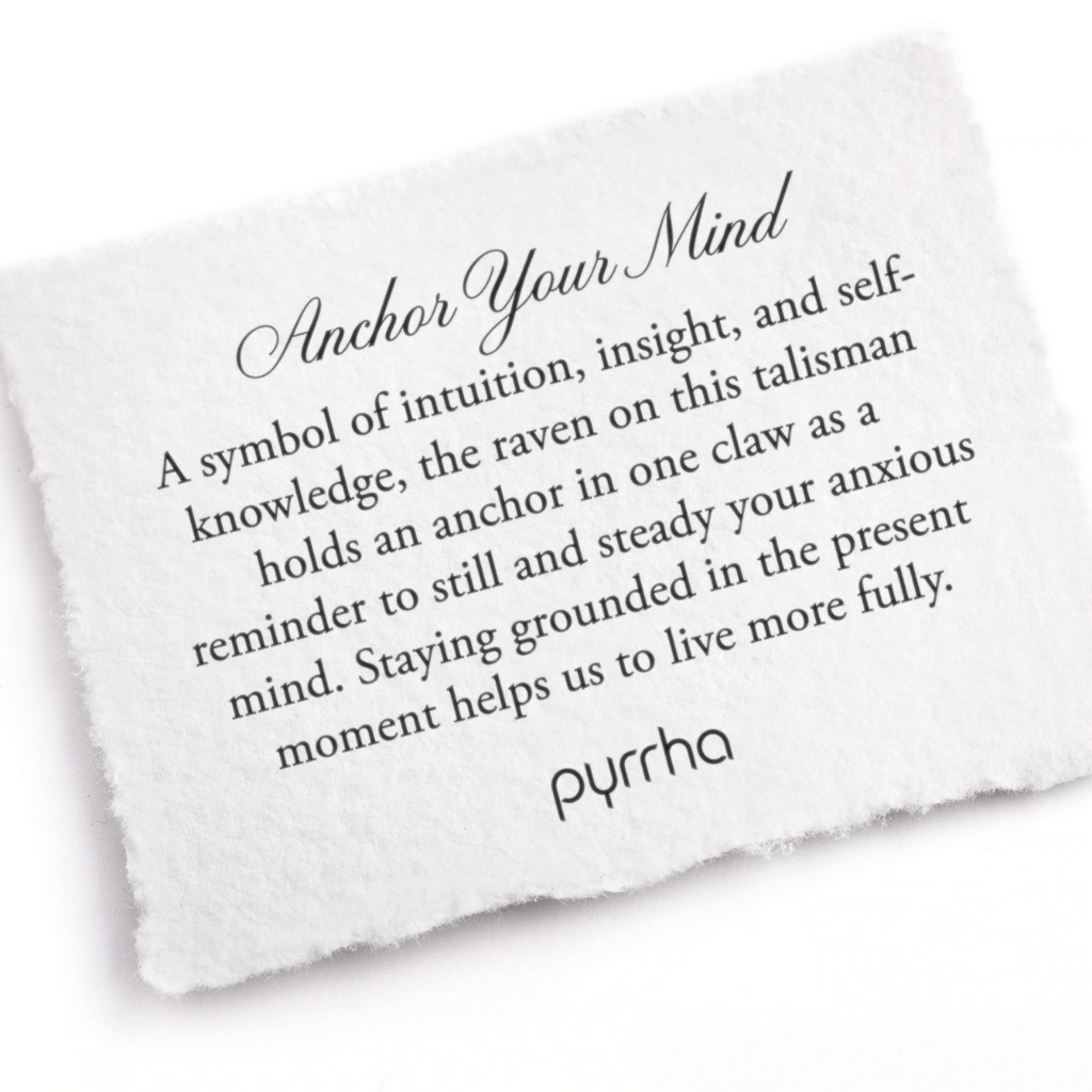 Cast using authentic wax seals and imagery from the Victorian Era, Pyrrha talismans are designed to inspire the wearer with its heralded meaning. A symbol of intuition, insight, and self-knowledge, the raven on this talisman holds an anchor in one claw as a reminder to still and steady your anxious mind. Staying grounded in the present moment helps us to live more fully. Made of 100% recycled sterling silver, the pendant measures 0.75" x 0.70". The chain is 18". Comes with a meaning card. Handcrafted in Vancouver, Canada.