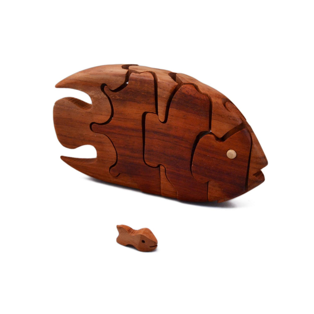Find your inner child with 3D wooden puzzles by Peter Chapman! Each puzzle is hand sculpted from a single piece of wood, and hides a secret object inside. This angelfish and little fish puzzle is made of padauk wood and measures 7”.