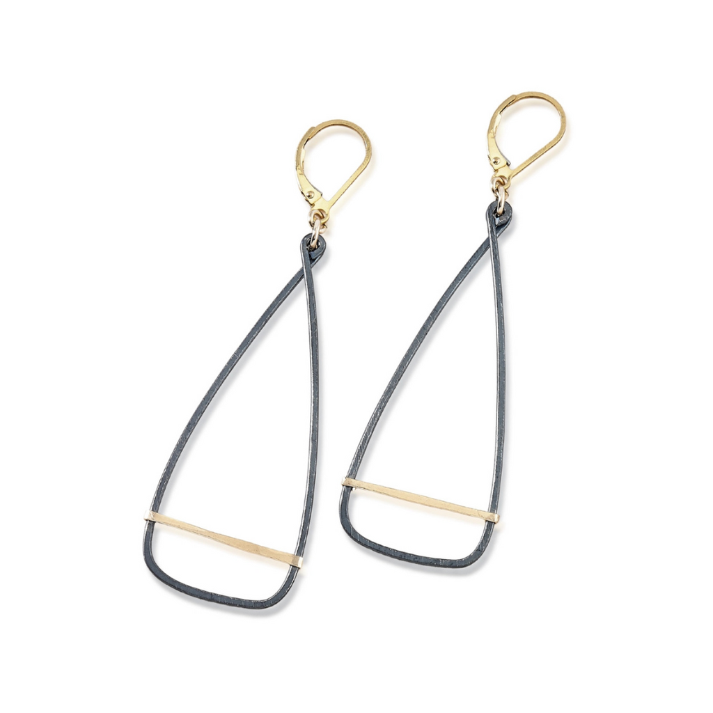 Minimalism at its best, these antique oar earrings by Freshie & Zero are light, sexy, and great for everyday wear! The not-so-perfect oxidized silver wire is bent to outline a pleasing oar shape with a gold filled bar. The oar shapes are suspended on gold filled lever back ear wires. These earrings measure approximately 0.75" wide and measure 2.87" from the top of the ear wire to the bottom of the circle. Handmade in US.