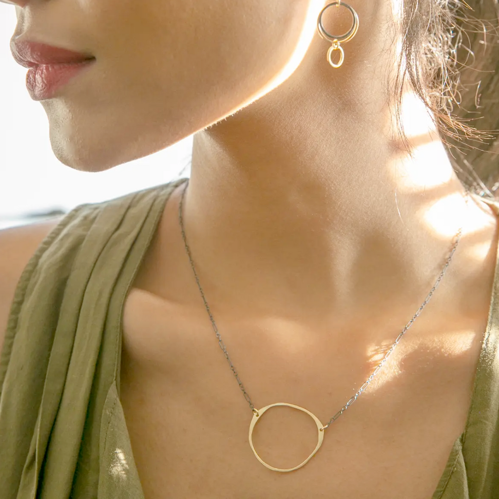 Minimalism at its best, this mixed metal Antique Stone necklace by Freshie & Zero is light, sexy, and great for everyday wear! A hand-shaped and hammered oblong gold-filled circle is suspended on a textured 16" oxidized sterling silver chain, giving it a nice color contract and visual interest. The pendant measures approximately 1" tall and 1.18" wide. Handmade in US.