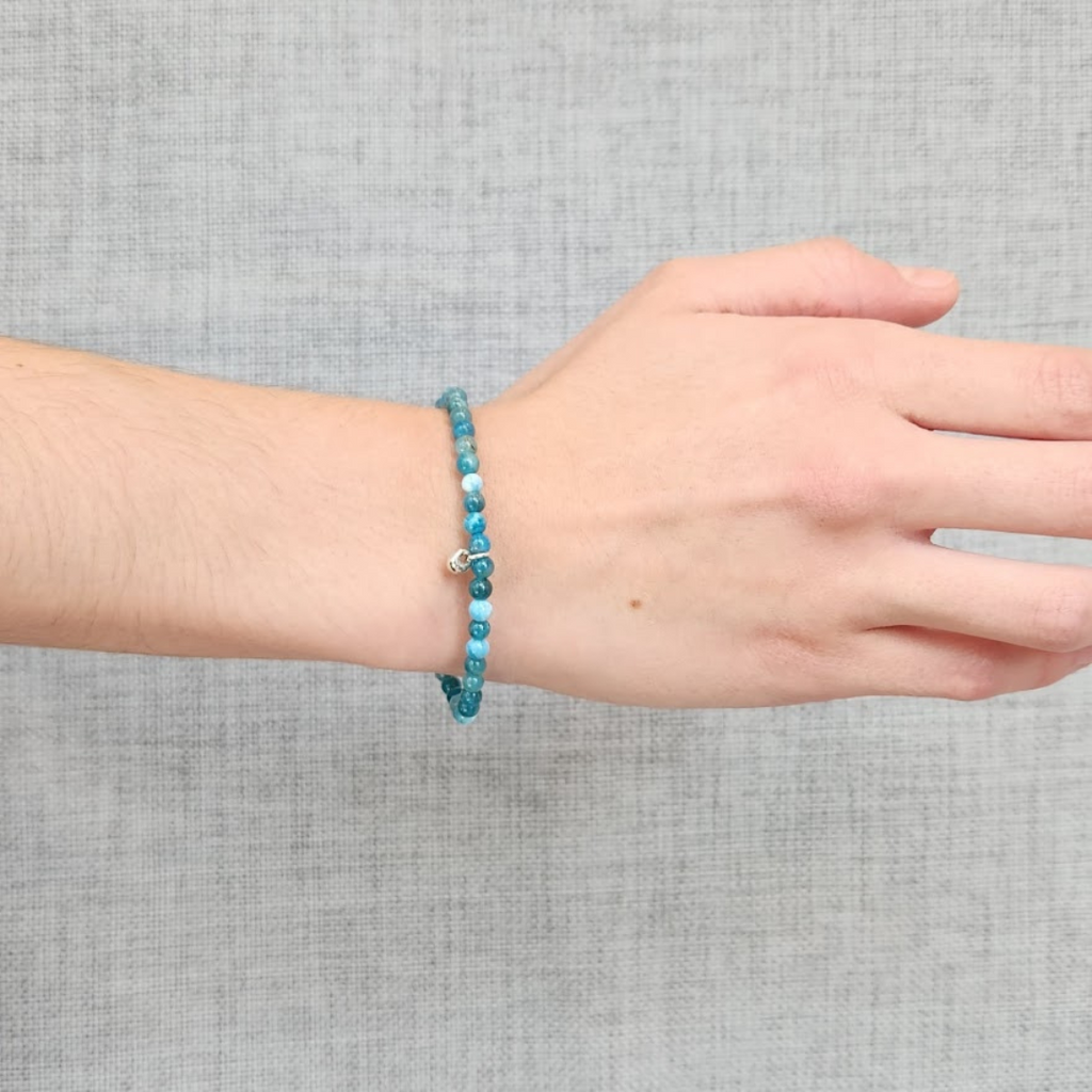 Cast from stones with a hole found on the beaches of Gimli, Manitoba, Canada, Johanna Brierley's jewelry embraces the organic beauty created by nature. Hole stones are believed to channel good luck, and thus the artist creates simple, long-lasting pieces that symbolize luck and fortune. Made with smooth round apatite beads, this stretchie bracelet features a surprise sterling silver lucky stone! Apatite is thought to symbolize acceptance, creativity, learning, and enhances insight. Bracelet measures 7". Handcrafted in Canada.