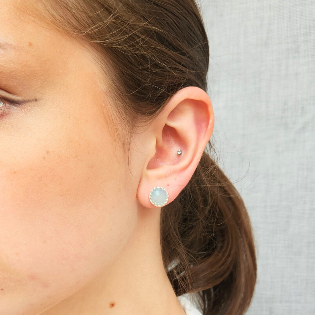 Handmade locally by our wonderful custom designer, Tobi Sznajderman! These sterling silver stud earrings feature 9mm rose cut aqua chalcedony set in crown bezels. They measures approximately 0.38" in diameter. Handmade in the US.