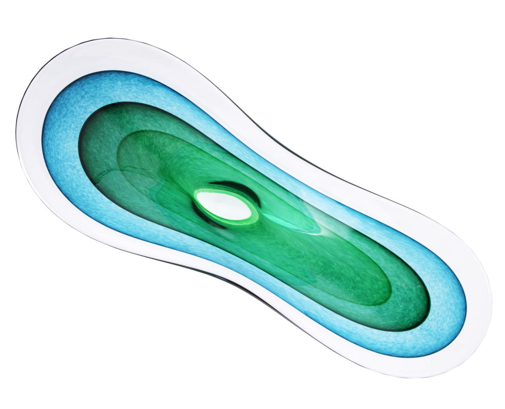 Elegant shapes and stunning colors define the Saturn Bowls by Teign Valley Glass! Hand-blown in the rich color of aqua, the bowl measures approx. 16 inches long by 7.5 inches wide by 4.5 inches high. Handcrafted in England.