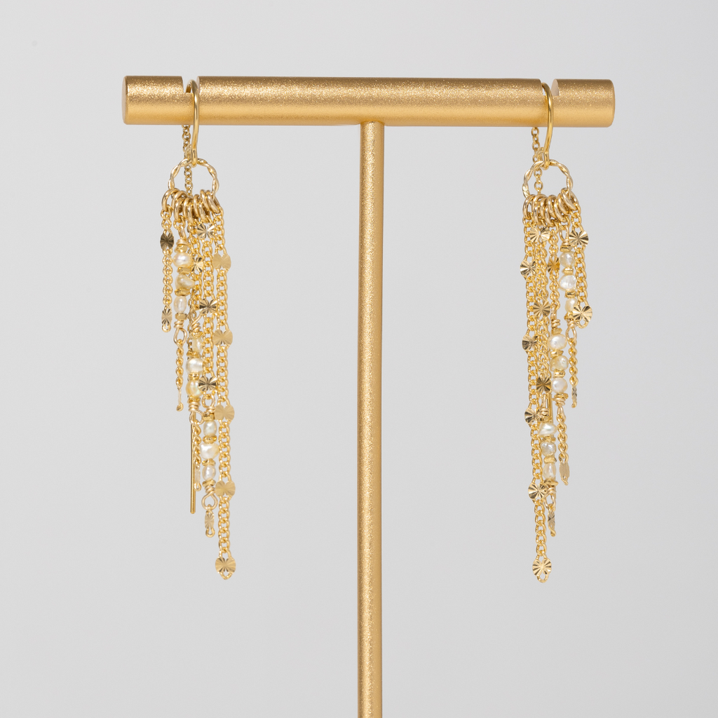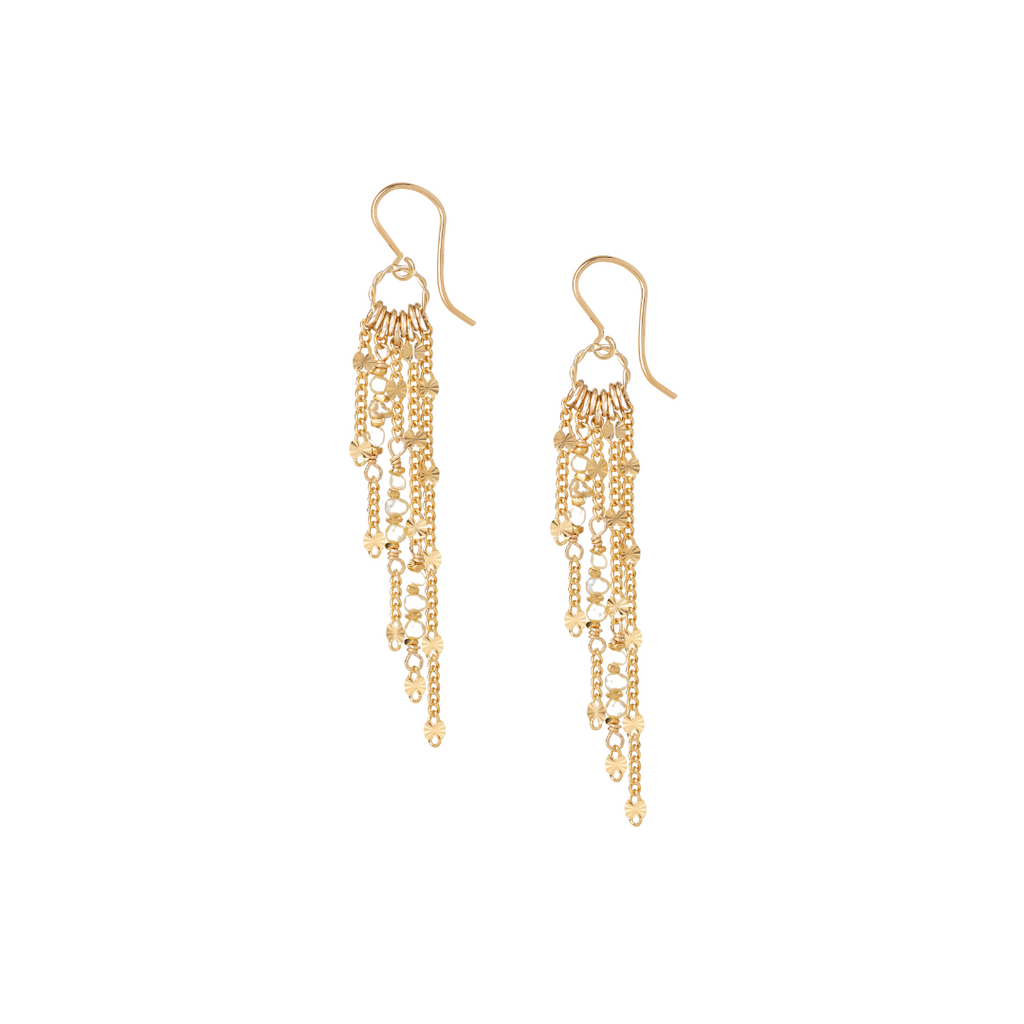 Defined by modern elegance, Kate Winternitz creates delicate, thoughtful jewelry to showcase her love of detail and composition. These Aranza Earrings feature a simple twisted circle with cascading silhouette of chains with white freshwater pearls. Made from 14kt gold fill, the earrings measure 2.5" long from the top of the earwire and 0.25" wide. Handmade in US.