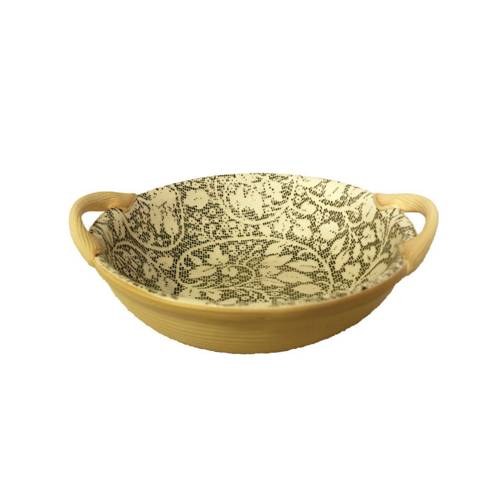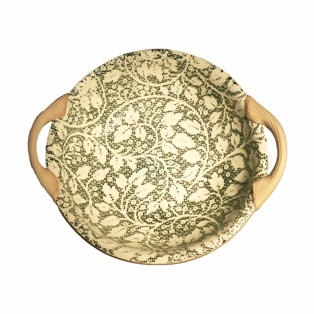 Alive with color and texture, this ceramic vegetable bowl is as functional as it is beautiful. Using fabric and lace as a stencil to create this Arcadia pattern in the rich color of pine, the 9 inch vegetable bowl is ideal for every day use and will add to your decor. With bold patterns and colors, mix and match with other dinnerware for a unique table setting! Dishwasher safe. Measures 10.5 x 2.75 inches. Made in the US.