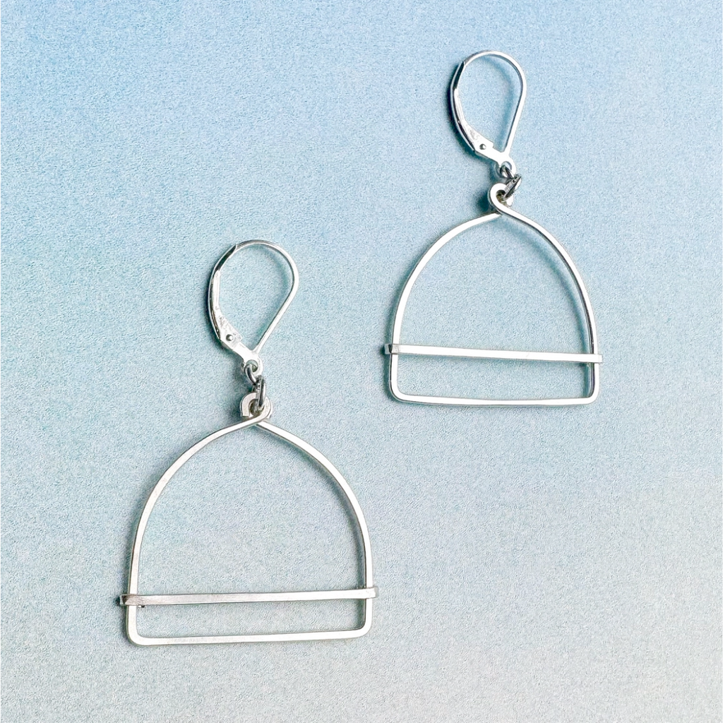 These Arch Doorway earrings by Freshie & Zerio are perfect for every day wear or can be dressed up for a night out. Made of sterling silver arches accented with an offset bar, these minimalist earrings are lightweight and sculptural. Earrings measure approximately 1.13" wide, and 1.88" long from the top of the silver leverback earwires. Handmade in US.