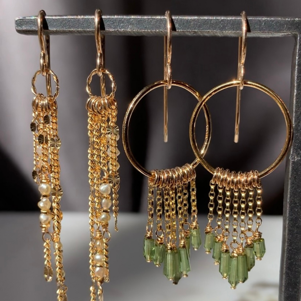 Defined by modern elegance, Kate Winternitz creates delicate, thoughtful jewelry to showcase her love of detail and composition. These Aria Earrings feature a simple circle with cascading silhouette of chains with green tourmaline beads on the bottom. Made from 14kt gold fill, the earrings measure 2" long from the top of the earwire and 0.5" wide. Handmade in US.