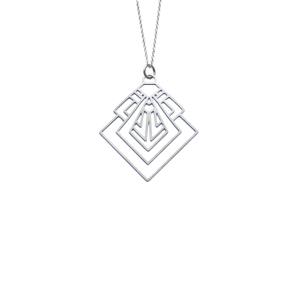 Redolent of shapes and patterns found in nature and in textiles, this art deco necklace by Daphne Olive is elegant, yet bold and fun to wear. Made of stainless steel with an 18" sterling silver chain, the pendant measures 1.7" x 1.5". Handcrafted in US.