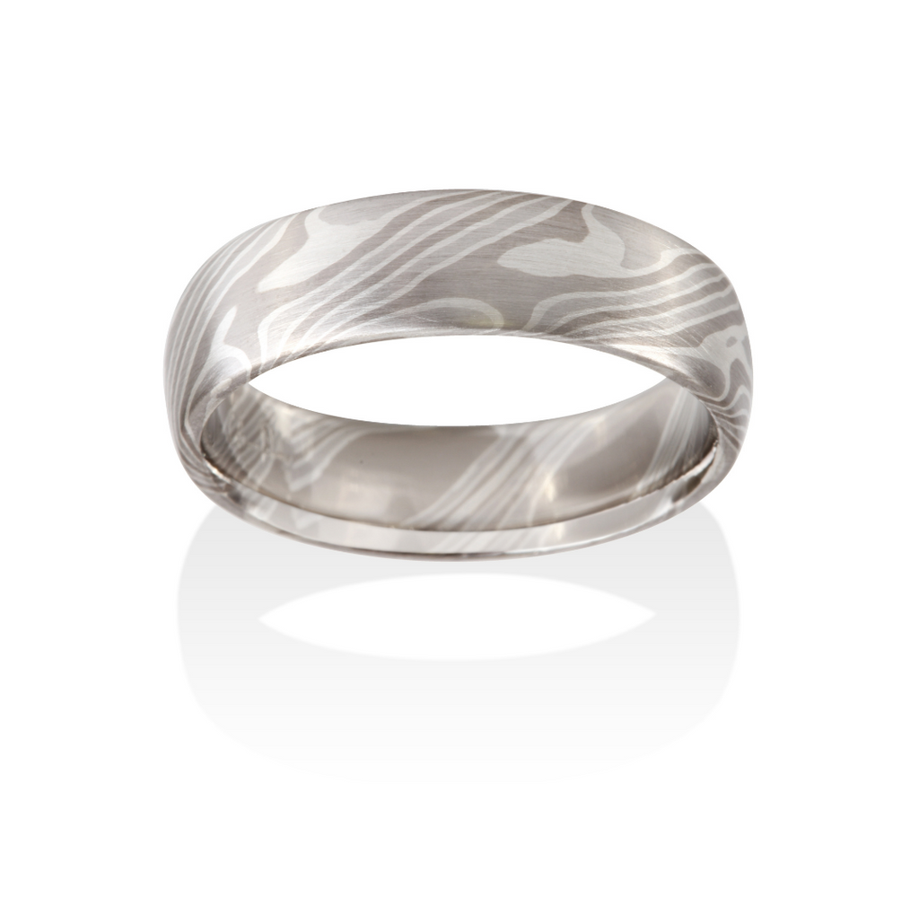 This Chris Ploof mokume-gane ring is created from palladium 500 and sterling silver with a semi-round profile and comfort fit interior. Measures 6mm wide and is a size 10.25. Available for order in other metals, widths, and ring sizes. Please contact us at 413-586-1119 for more information.