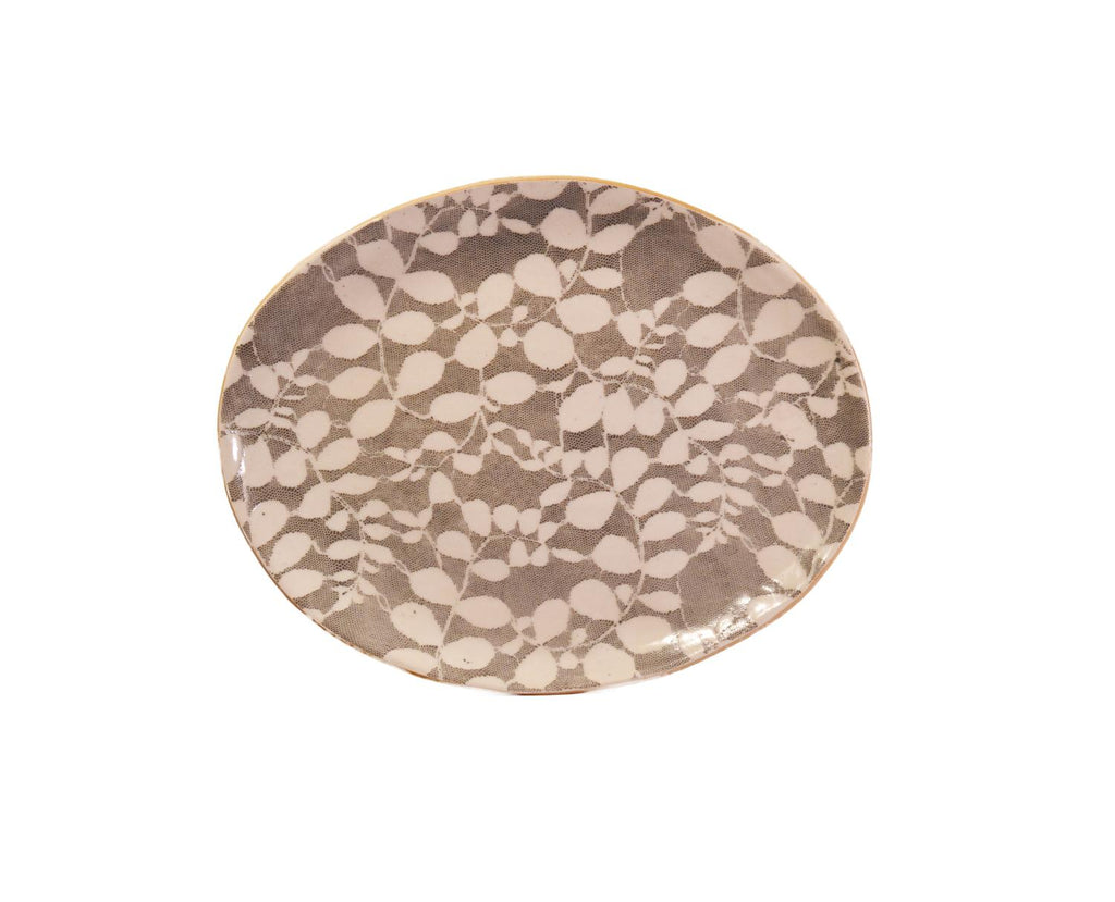 Alive with color and texture, this ceramic small oval platter by Terrafirma is as functional as it is beautiful. Using fabric and lace as a stencil to create this aspen pattern in the rich color of charcoal, the small oval is ideal for every day use and will add to your decor. With bold patterns and colors, mix and match with other dinnerware for a unique table setting! Dishwasher safe. Measures 12 x 9 inches. Made in the US.